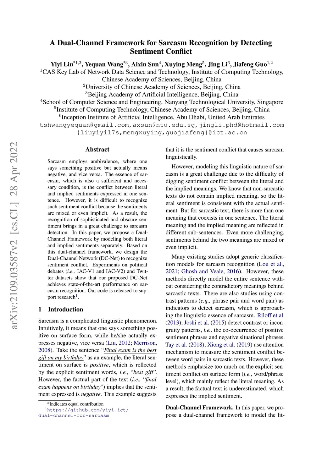 A Dual-Channel Framework for Sarcasm Recognition by Detecting Sentiment
