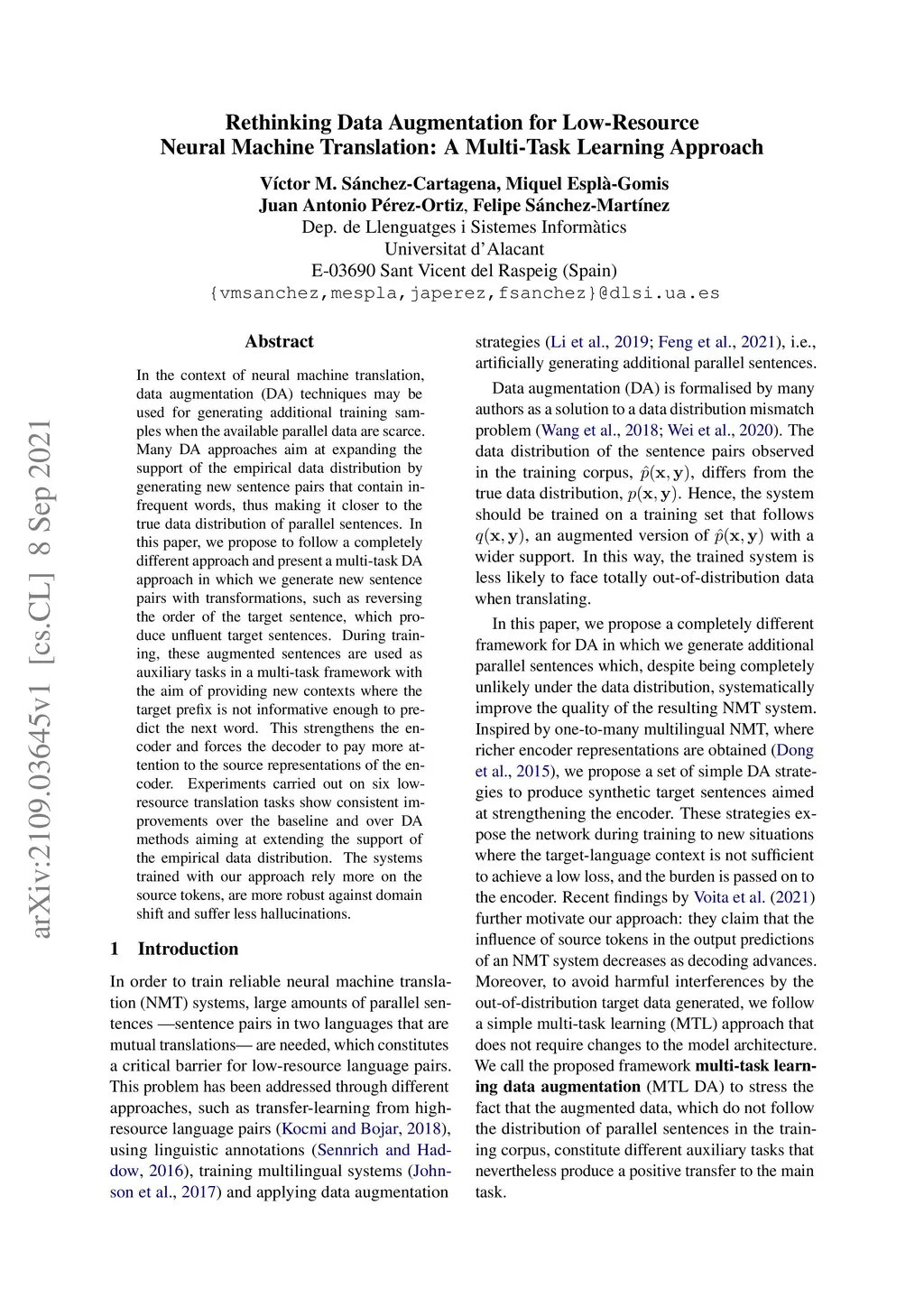 In the context of neural machine translation, data augmentation (DA) techniques may be used for generating additional training samples when the available parallel data are scarce. Many DA approaches aim at expanding the support of the empirical data distribution by generating new sentence pairs that contain infrequent words, thus making it closer to the true data distribution of parallel sentences. In this paper, we propose to follow a completely different approach and present a multi-task DA approach in which we generate new sentence pairs with transformations, such as reversing the order of the target sentence, which produce unfluent target sentences. During training, these augmented sentences are used as auxiliary tasks in a multi-task framework with the aim of providing new contexts where the target prefix is not informative enough to predict the next word. This strengthens the encoder and forces the decoder to pay more attention to the source representations of the encoder. Experiments carried out on six low-resource translation tasks show consistent improvements over the baseline and over DA methods aiming at extending the support of the empirical data distribution. The systems trained with our approach rely more on the source tokens, are more robust against domain shift and suffer less hallucinations.