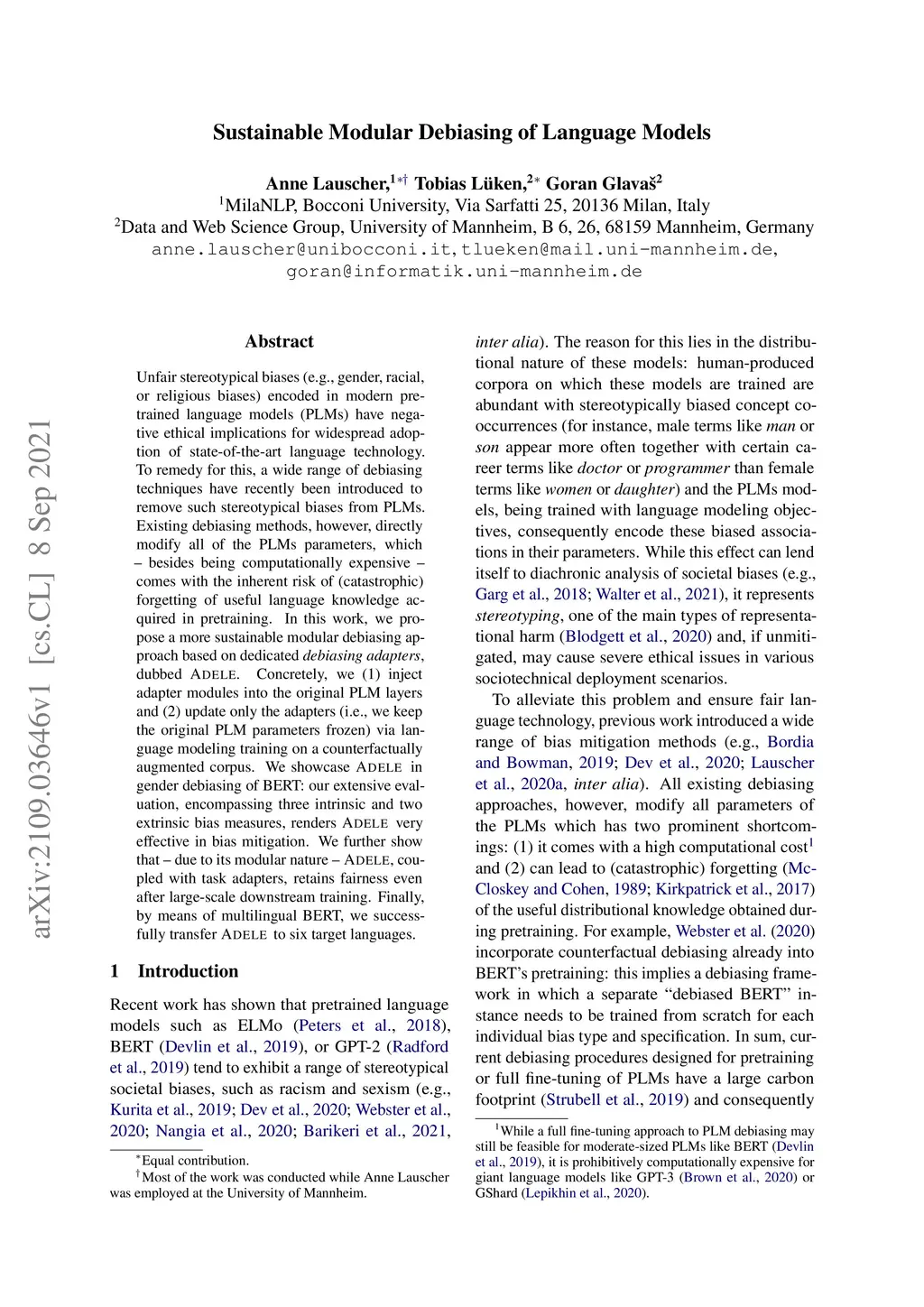 Unfair stereotypical biases (e.g., gender, racial, or religious biases) encoded in modern pretrained language models (PLMs) have negative ethical implications for widespread adoption of state-of-the-art language technology. To remedy for this, a wide range of debiasing techniques have recently been introduced to remove such stereotypical biases from PLMs. Existing debiasing methods, however, directly modify all of the PLMs parameters, which -- besides being computationally expensive -- comes with the inherent risk of (catastrophic) forgetting of useful language knowledge acquired in pretraining. In this work, we propose a more sustainable modular debiasing approach based on dedicated debiasing adapters, dubbed ADELE. Concretely, we (1) inject adapter modules into the original PLM layers and (2) update only the adapters (i.e., we keep the original PLM parameters frozen) via language modeling training on a counterfactually augmented corpus. We showcase ADELE, in gender debiasing of BERT: our extensive evaluation, encompassing three intrinsic and two extrinsic bias measures, renders ADELE, very effective in bias mitigation. We further show that -- due to its modular nature -- ADELE, coupled with task adapters, retains fairness even after large-scale downstream training. Finally, by means of multilingual BERT, we successfully transfer ADELE, to six target languages.