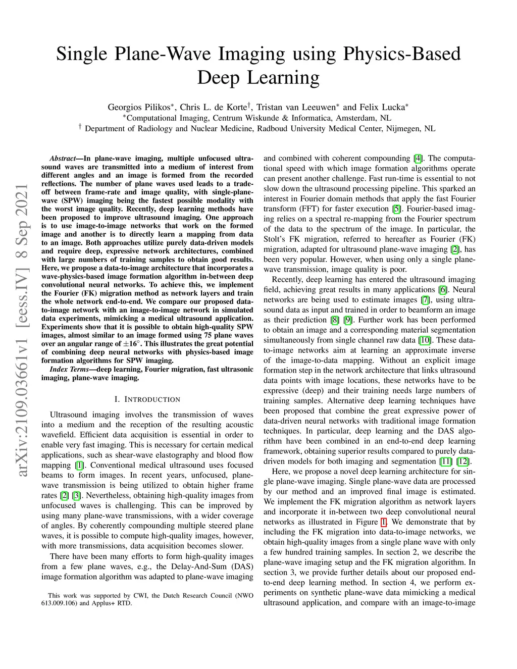 In plane-wave imaging, multiple unfocused ultrasound waves are transmitted into a medium of interest from different angles and an image is formed from the recorded reflections. The number of plane waves used leads to a trade-off between frame-rate and image quality, with single-plane-wave (SPW) imaging being the fastest possible modality with the worst image quality. Recently, deep learning methods have been proposed to improve ultrasound imaging. One approach is to use image-to-image networks that work on the formed image and another is to directly learn a mapping from data to an image. Both approaches utilize purely data-driven models and require deep, expressive network architectures, combined with large numbers of training samples to obtain good results. Here, we propose a data-to-image architecture that incorporates a wave-physics-based image formation algorithm in-between deep convolutional neural networks. To achieve this, we implement the Fourier (FK) migration method as network layers and train the whole network end-to-end. We compare our proposed data-to-image network with an image-to-image network in simulated data experiments, mimicking a medical ultrasound application. Experiments show that it is possible to obtain high-quality SPW images, almost similar to an image formed using 75 plane waves over an angular range of 16. This illustrates the great potential of combining deep neural networks with physics-based image formation algorithms for SPW imaging.