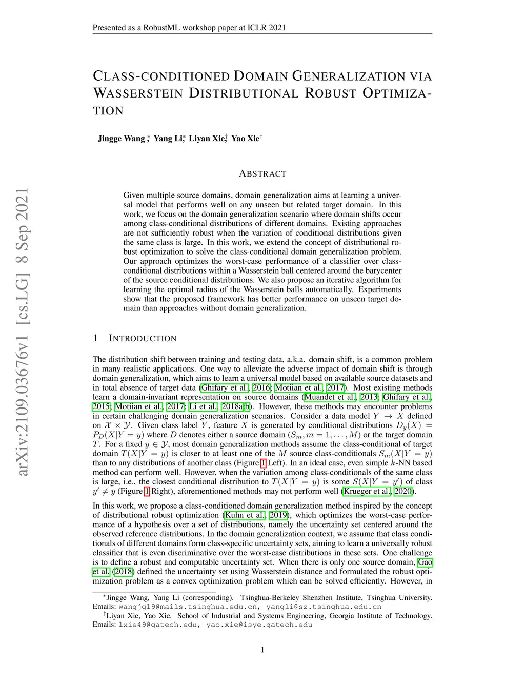Given multiple source domains, domain generalization aims at learning a universal model that performs well on any unseen but related target domain. In this work, we focus on the domain generalization scenario where domain shifts occur among class-conditional distributions of different domains. Existing approaches are not sufficiently robust when the variation of conditional distributions given the same class is large. In this work, we extend the concept of distributional robust optimization to solve the class-conditional domain generalization problem. Our approach optimizes the worst-case performance of a classifier over class-conditional distributions within a Wasserstein ball centered around the barycenter of the source conditional distributions. We also propose an iterative algorithm for learning the optimal radius of the Wasserstein balls automatically. Experiments show that the proposed framework has better performance on unseen target domain than approaches without domain generalization.