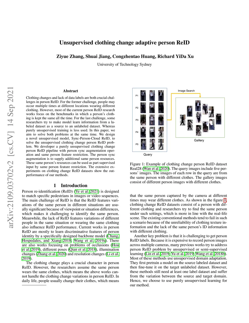 Clothing changes and lack of data labels are both crucial challenges in person ReID. For the former challenge, people may occur multiple times at different locations wearing different clothing. However, most of the current person ReID research works focus on the benchmarks in which a person's clothing is kept the same all the time. For the last challenge, some researchers try to make model learn information from a labeled dataset as a source to an unlabeled dataset. Whereas purely unsupervised training is less used. In this paper, we aim to solve both problems at the same time. We design a novel unsupervised model, Sync-Person-Cloud ReID, to solve the unsupervised clothing change person ReID problem. We developer a purely unsupervised clothing change person ReID pipeline with person sync augmentation operation and same person feature restriction. The person sync augmentation is to supply additional same person resources. These same person's resources can be used as part supervised input by same person feature restriction. The extensive experiments on clothing change ReID datasets show the out-performance of our methods.