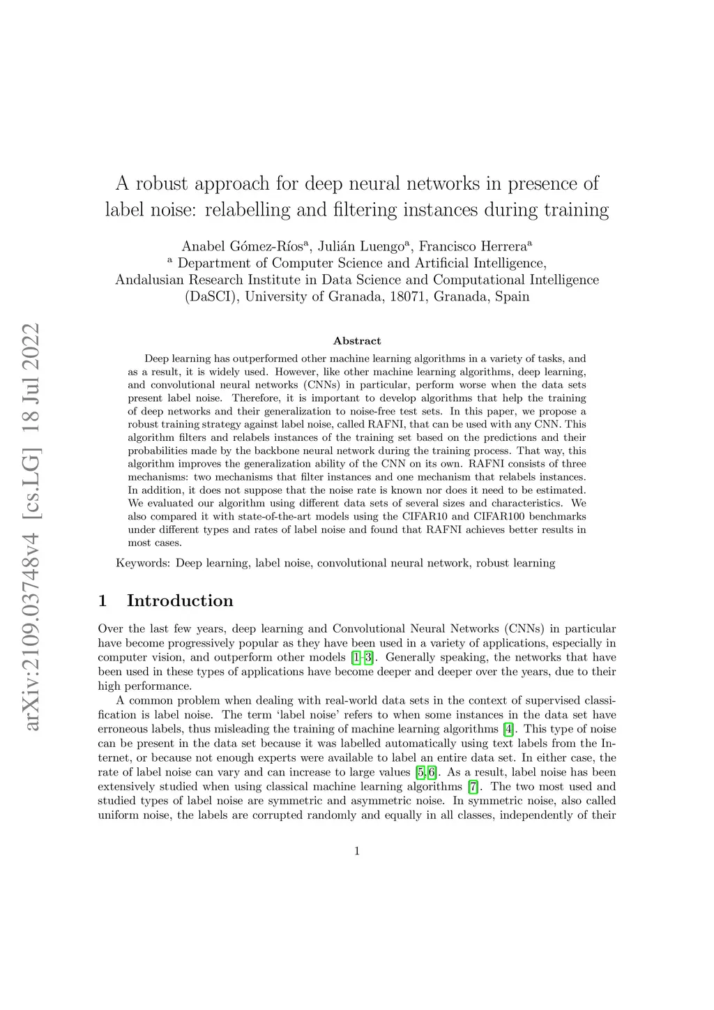 Deep learning has outperformed other machine learning algorithms in a variety of tasks, and as a result, it is widely used. However, like other machine learning algorithms, deep learning, and convolutional neural networks (CNNs) in particular, perform worse when the data sets present label noise. Therefore, it is important to develop algorithms that help the training of deep networks and their generalization to noise-free test sets. In this paper, we propose a robust training strategy against label noise, called RAFNI, that can be used with any CNN. This algorithm filters and relabels instances of the training set based on the predictions and their probabilities made by the backbone neural network during the training process. That way, this algorithm improves the generalization ability of the CNN on its own. RAFNI consists of three mechanisms: two mechanisms that filter instances and one mechanism that relabels instances. In addition, it does not suppose that the noise rate is known nor does it need to be estimated. We evaluated our algorithm using different data sets of several sizes and characteristics. We also compared it with state-of-the-art models using the CIFAR10 and CIFAR100 benchmarks under different types and rates of label noise and found that RAFNI achieves better results in most cases.