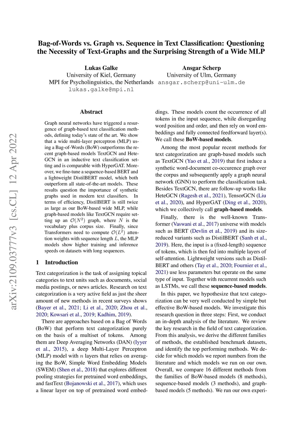 Graph neural networks have triggered a resurgence of graph-based text classification methods, defining today's state of the art. We show that a wide multi-layer perceptron (MLP) using a Bag-of-Words (BoW) outperforms the recent graph-based models TextGCN and HeteGCN in an inductive text classification setting and is comparable with HyperGAT. Moreover, we fine-tune a sequence-based BERT and a lightweight DistilBERT model, which both outperform all state-of-the-art models. These results question the importance of synthetic graphs used in modern text classifiers. In terms of efficiency, DistilBERT is still twice as large as our BoW-based wide MLP, while graph-based models like TextGCN require setting up an graph, where is the vocabulary plus corpus size. Finally, since Transformers need to compute attention weights with sequence length , the MLP models show higher training and inference speeds on datasets with long sequences.