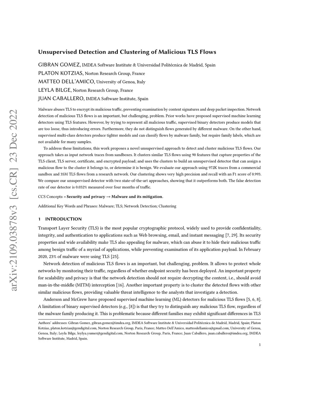 Unsupervised Detection and Clustering of Malicious TLS Flows