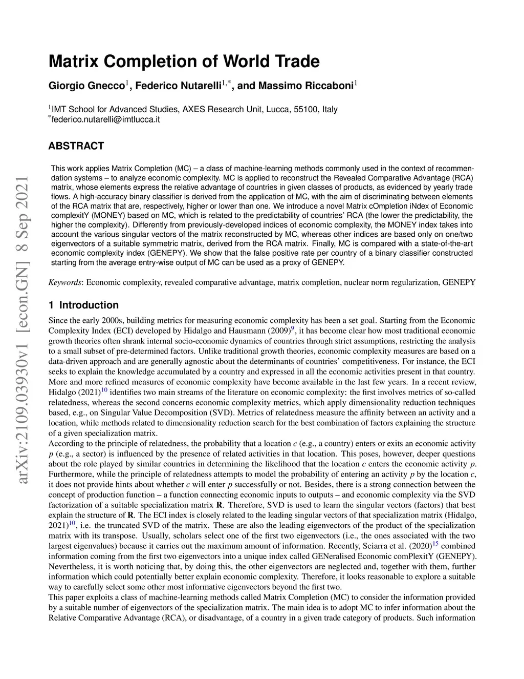 This work applies Matrix Completion (MC) -- a class of machine-learning methods commonly used in the context of recommendation systems -- to analyse economic complexity. MC is applied to reconstruct the Revealed Comparative Advantage (RCA) matrix, whose elements express the relative advantage of countries in given classes of products, as evidenced by yearly trade flows. A high-accuracy binary classifier is derived from the application of MC, with the aim of discriminating between elements of the RCA matrix that are, respectively, higher or lower than one. We introduce a novel Matrix cOmpletion iNdex of Economic complexitY (MONEY) based on MC, which is related to the predictability of countries' RCA (the lower the predictability, the higher the complexity). Differently from previously-developed indices of economic complexity, the MONEY index takes into account the various singular vectors of the matrix reconstructed by MC, whereas other indices are based only on one/two eigenvectors of a suitable symmetric matrix, derived from the RCA matrix. Finally, MC is compared with a state-of-the-art economic complexity index (GENEPY). We show that the false positive rate per country of a binary classifier constructed starting from the average entry-wise output of MC can be used as a proxy of GENEPY.