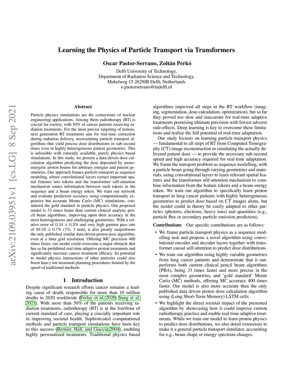Particle physics simulations are the cornerstone of nuclear engineering applications. Among them radiotherapy (RT) is crucial for society, with 50% of cancer patients receiving radiation treatments. For the most precise targeting of tumors, next generation RT treatments aim for real-time correction during radiation delivery, necessitating particle transport algorithms that yield precise dose distributions in sub-second times even in highly heterogeneous patient geometries. This is infeasible with currently available, purely physics based simulations. In this study, we present a data-driven dose calculation algorithm predicting the dose deposited by mono-energetic proton beams for arbitrary energies and patient geometries. Our approach frames particle transport as sequence modeling, where convolutional layers extract important spatial features into tokens and the transformer self-attention mechanism routes information between such tokens in the sequence and a beam energy token. We train our network and evaluate prediction accuracy using computationally expensive but accurate Monte Carlo (MC) simulations, considered the gold standard in particle physics. Our proposed model is 33 times faster than current clinical analytic pencil beam algorithms, improving upon their accuracy in the most heterogeneous and challenging geometries. With a relative error of 0.34% and very high gamma pass rate of 99.59% (1%, 3 mm), it also greatly outperforms the only published similar data-driven proton dose algorithm, even at a finer grid resolution. Offering MC precision 400 times faster, our model could overcome a major obstacle that has so far prohibited real-time adaptive proton treatments and significantly increase cancer treatment efficacy. Its potential to model physics interactions of other particles could also boost heavy ion treatment planning procedures limited by the speed of traditional methods.