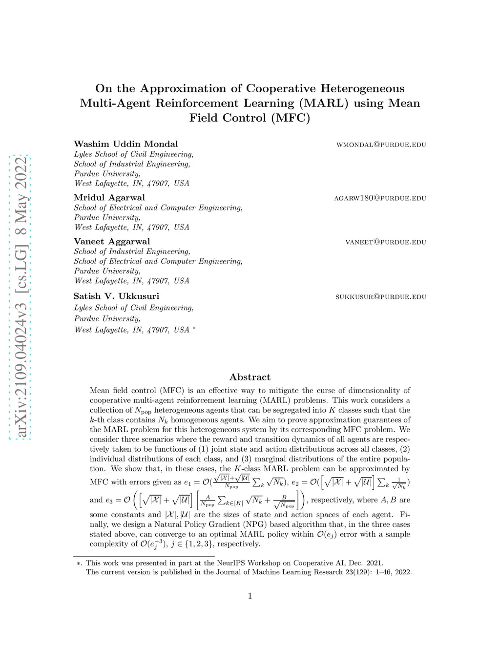 Reinforcement Learning (MARL) using Mean Field Control (MFC)