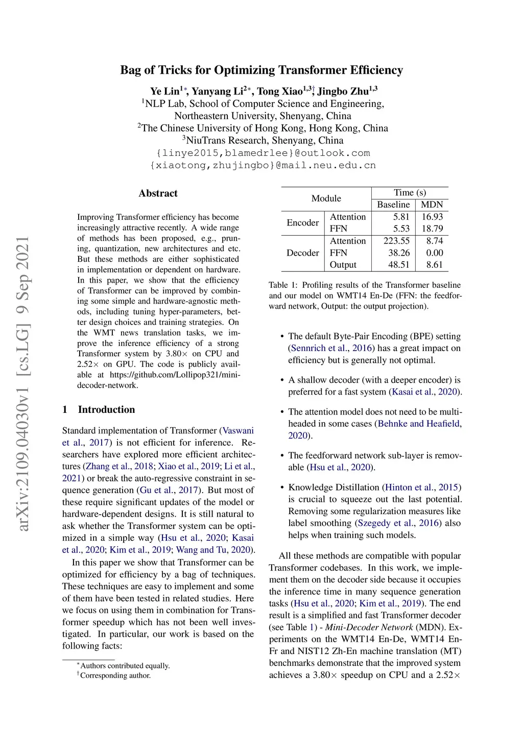Improving Transformer efficiency has become increasingly attractive recently. A wide range of methods has been proposed, e.g., pruning, quantization, new architectures and etc. But these methods are either sophisticated in implementation or dependent on hardware. In this paper, we show that the efficiency of Transformer can be improved by combining some simple and hardware-agnostic methods, including tuning hyper-parameters, better design choices and training strategies. On the WMT news translation tasks, we improve the inference efficiency of a strong Transformer system by 3.80X on CPU and 2.52X on GPU. The code is publicly available at https://github.com/Lollipop321/mini-decoder-network.