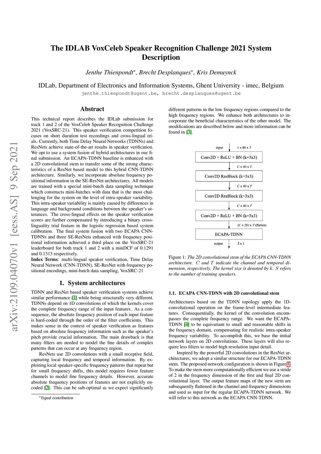 This technical report describes the IDLab submission for track 1 and 2 of the VoxCeleb Speaker Recognition Challenge 2021 (VoxSRC-21). This speaker verification competition focuses on short duration test recordings and cross-lingual trials. Currently, both Time Delay Neural Networks (TDNNs) and ResNets achieve state-of-the-art results in speaker verification. We opt to use a system fusion of hybrid architectures in our final submission. An ECAPA-TDNN baseline is enhanced with a 2D convolutional stem to transfer some of the strong characteristics of a ResNet based model to this hybrid CNN-TDNN architecture. Similarly, we incorporate absolute frequency positional information in the SE-ResNet architectures. All models are trained with a special mini-batch data sampling technique which constructs mini-batches with data that is the most challenging for the system on the level of intra-speaker variability. This intra-speaker variability is mainly caused by differences in language and background conditions between the speaker's utterances. The cross-lingual effects on the speaker verification scores are further compensated by introducing a binary cross-linguality trial feature in the logistic regression based system calibration. The final system fusion with two ECAPA CNN-TDNNs and three SE-ResNets enhanced with frequency positional information achieved a third place on the VoxSRC-21 leaderboard for both track 1 and 2 with a minDCF of 0.1291 and 0.1313 respectively.