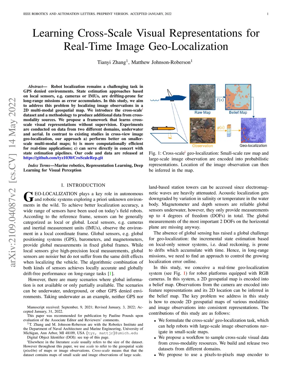 Robot localization remains a challenging task in GPS denied environments. State estimation approaches based on local sensors, e.g. cameras or IMUs, are drifting-prone for long-range missions as error accumulates. In this study, we aim to address this problem by localizing image observations in a 2D multi-modal geospatial map. We introduce the cross-scale dataset and a methodology to produce additional data from cross-modality sources. We propose a framework that learns cross-scale visual representations without supervision. Experiments are conducted on data from two different domains, underwater and aerial. In contrast to existing studies in cross-view image geo-localization, our approach a) performs better on smaller-scale multi-modal maps; b) is more computationally efficient for real-time applications; c) can serve directly in concert with state estimation pipelines.