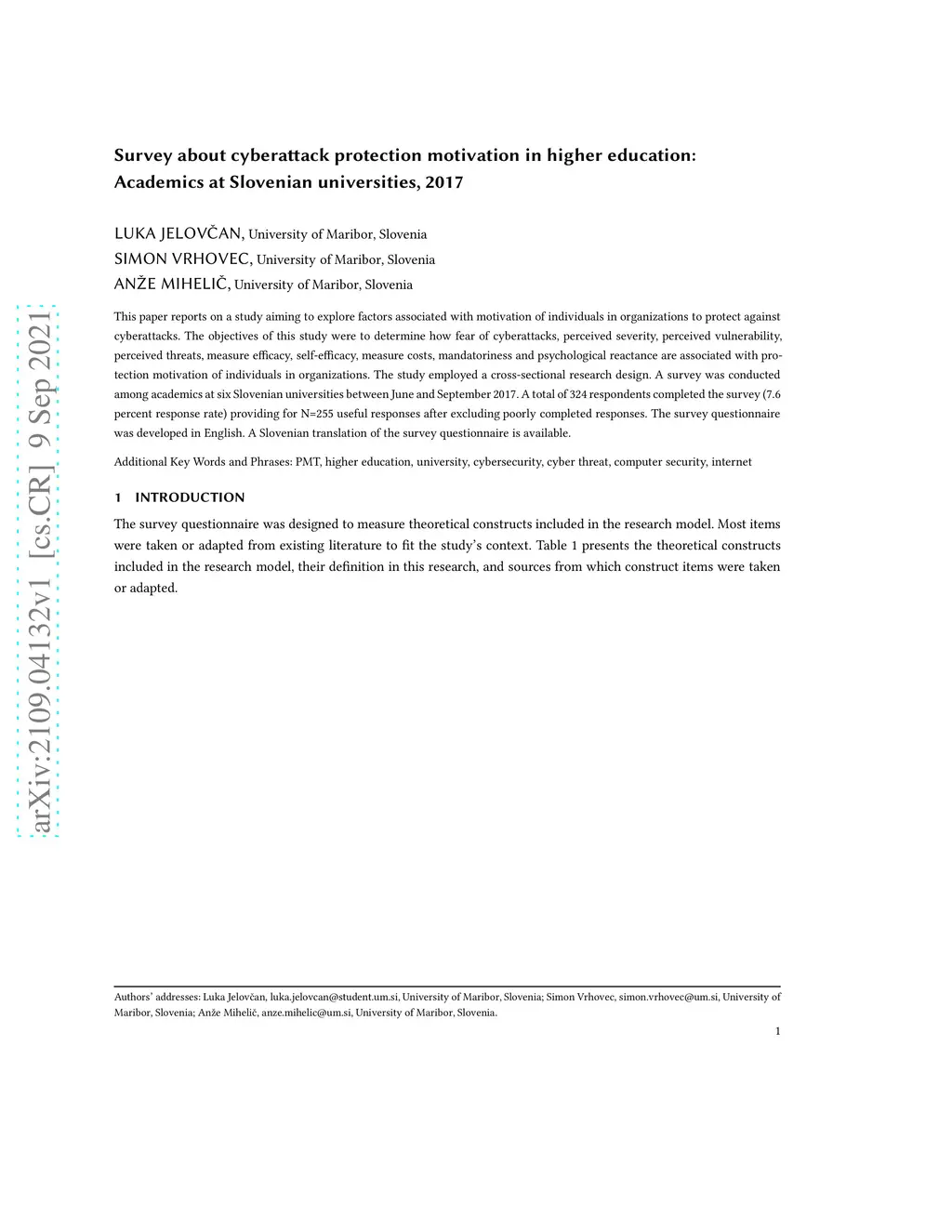 This paper reports on a study aiming to explore factors associated with motivation of individuals in organizations to protect against cyberattacks. The objectives of this study were to determine how fear of cyberattacks, perceived severity, perceived vulnerability, perceived threats, measure efficacy, self-efficacy, measure costs, mandatoriness and psychological reactance are associated with protection motivation of individuals in organizations. The study employed a cross-sectional research design. A survey was conducted among academics at six Slovenian universities between June and September 2017. A total of 324 respondents completed the survey (7.6 percent response rate) providing for N=255 useful responses after excluding poorly completed responses. The survey questionnaire was developed in English. A Slovenian translation of the survey questionnaire is available.