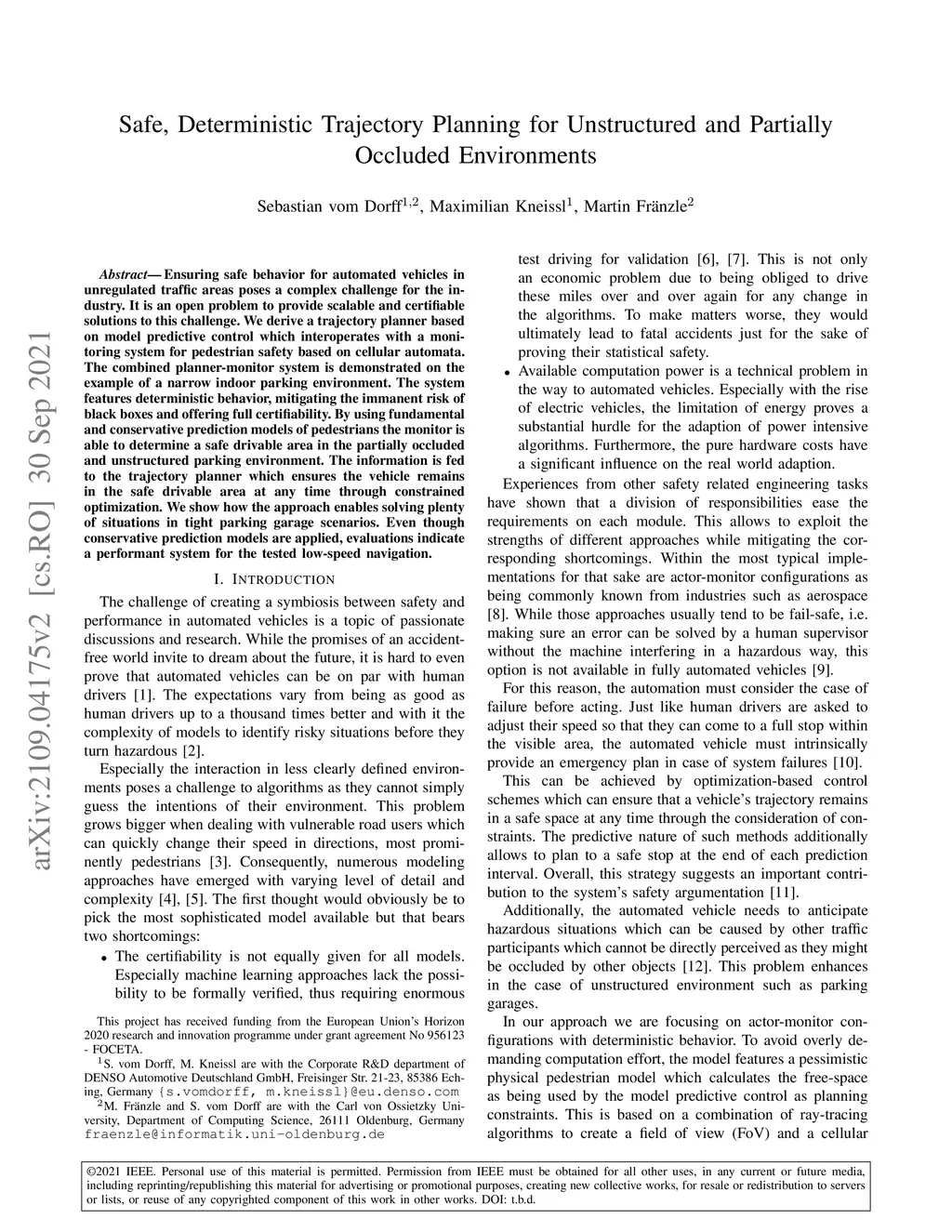 Ensuring safe behavior for automated vehicles in unregulated traffic areas poses a complex challenge for the industry. It is an open problem to provide scalable and certifiable solutions to this challenge. We derive a trajectory planner based on model predictive control which interoperates with a monitoring system for pedestrian safety based on cellular automata. The combined planner-monitor system is demonstrated on the example of a narrow indoor parking environment. The system features deterministic behavior, mitigating the immanent risk of black boxes and offering full certifiability. By using fundamental and conservative prediction models of pedestrians the monitor is able to determine a safe drivable area in the partially occluded and unstructured parking environment. The information is fed to the trajectory planner which ensures the vehicle remains in the safe drivable area at any time through constrained optimization. We show how the approach enables solving plenty of situations in tight parking garage scenarios. Even though conservative prediction models are applied, evaluations indicate a performant system for the tested low-speed navigation.