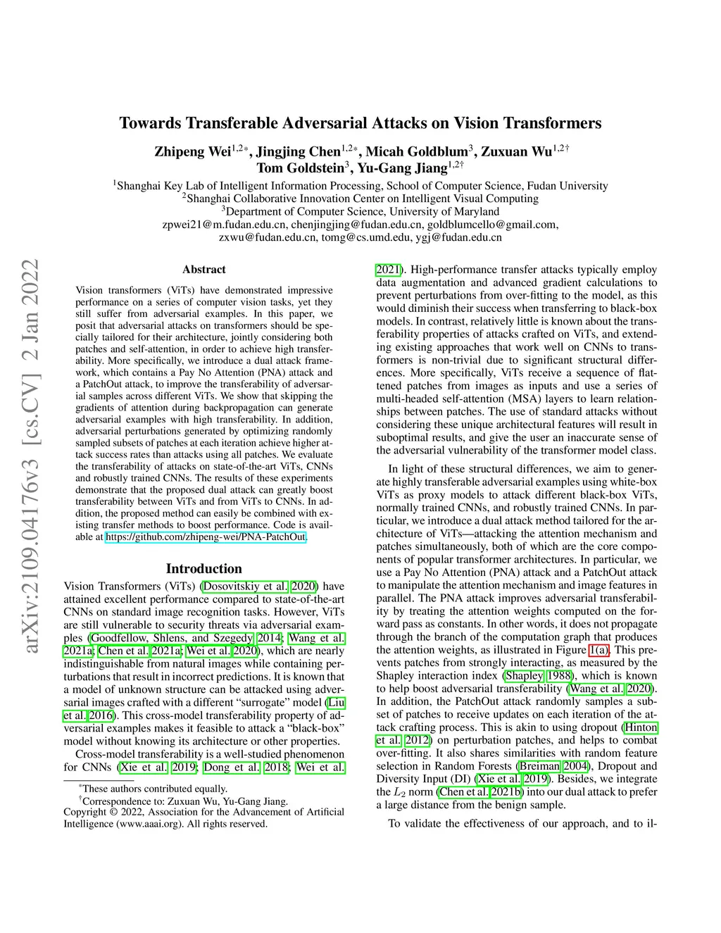 Vision transformers (ViTs) have demonstrated impressive performance on a series of computer vision tasks, yet they still suffer from adversarial examples. % crafted in a similar fashion as CNNs. In this paper, we posit that adversarial attacks on transformers should be specially tailored for their architecture, jointly considering both patches and self-attention, in order to achieve high transferability. More specifically, we introduce a dual attack framework, which contains a Pay No Attention (PNA) attack and a PatchOut attack, to improve the transferability of adversarial samples across different ViTs. We show that skipping the gradients of attention during backpropagation can generate adversarial examples with high transferability. In addition, adversarial perturbations generated by optimizing randomly sampled subsets of patches at each iteration achieve higher attack success rates than attacks using all patches. We evaluate the transferability of attacks on state-of-the-art ViTs, CNNs and robustly trained CNNs. The results of these experiments demonstrate that the proposed dual attack can greatly boost transferability between ViTs and from ViTs to CNNs. In addition, the proposed method can easily be combined with existing transfer methods to boost performance. Code is available at https://github.com/zhipeng-wei/PNA-PatchOut.