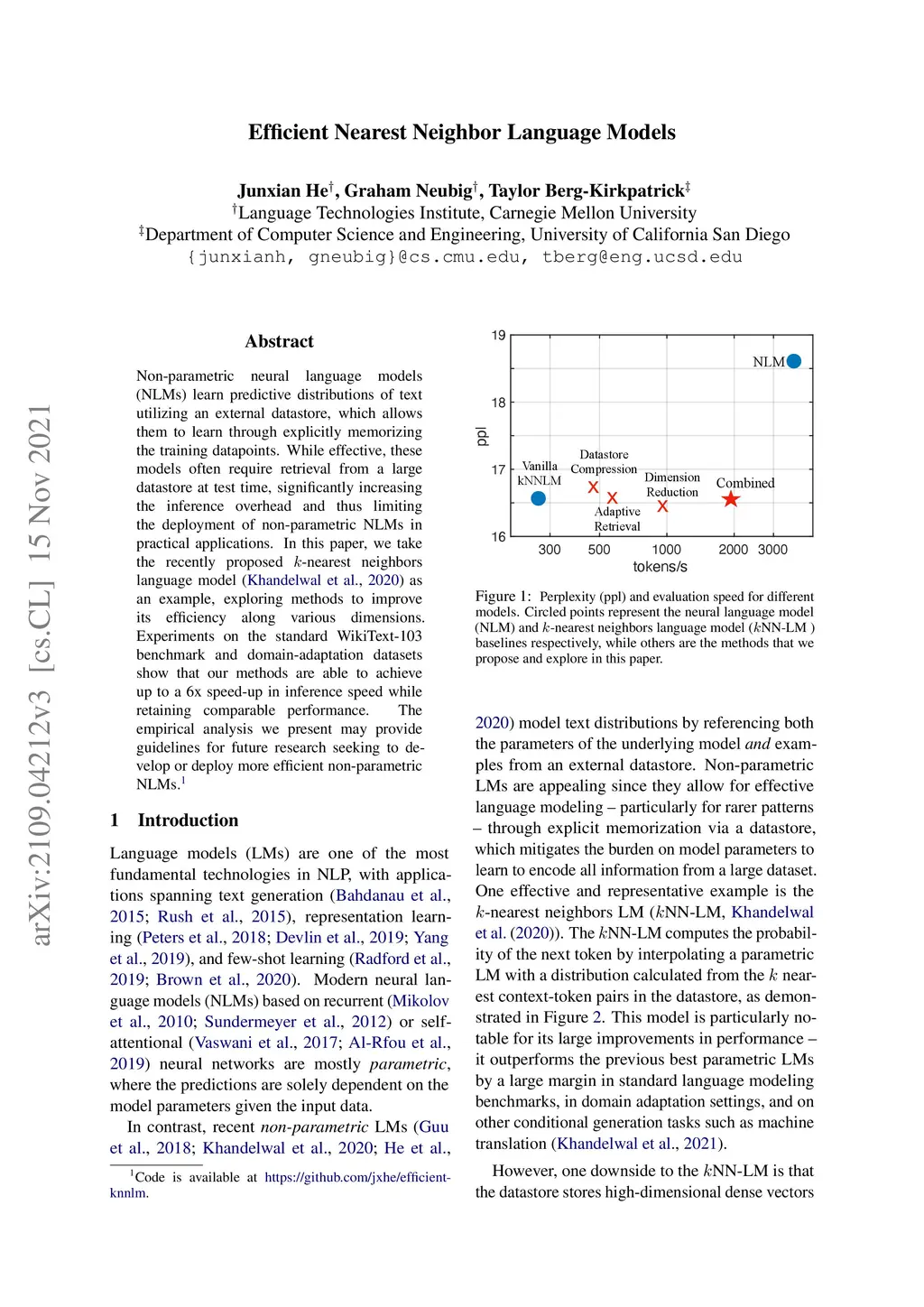 Non-parametric neural language models (NLMs) learn predictive distributions of text utilizing an external datastore, which allows them to learn through explicitly memorizing the training datapoints. While effective, these models often require retrieval from a large datastore at test time, significantly increasing the inference overhead and thus limiting the deployment of non-parametric NLMs in practical applications. In this paper, we take the recently proposed -nearest neighbors language model (Khandelwal et al., 2020) as an example, exploring methods to improve its efficiency along various dimensions. Experiments on the standard WikiText-103 benchmark and domain-adaptation datasets show that our methods are able to achieve up to a 6x speed-up in inference speed while retaining comparable performance. The empirical analysis we present may provide guidelines for future research seeking to develop or deploy more efficient non-parametric NLMs.