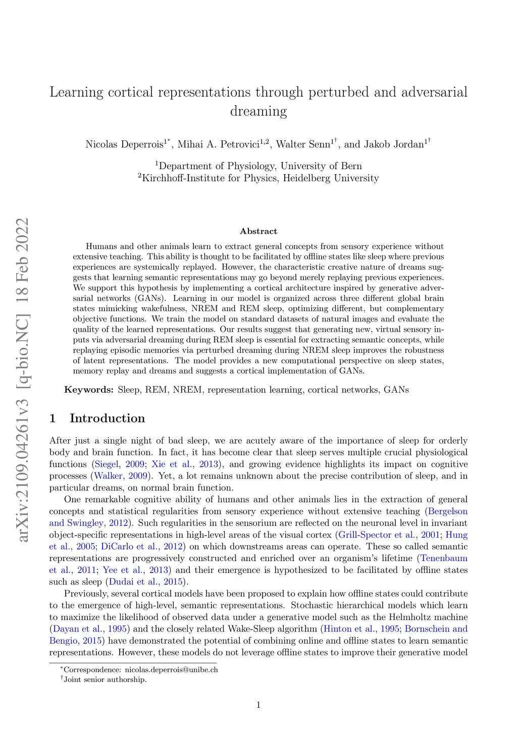 Humans and other animals learn to extract general concepts from sensory experience without extensive teaching. This ability is thought to be facilitated by offline states like sleep where previous experiences are systemically replayed. However, the characteristic creative nature of dreams suggests that learning semantic representations may go beyond merely replaying previous experiences. We support this hypothesis by implementing a cortical architecture inspired by generative adversarial networks (GANs). Learning in our model is organized across three different global brain states mimicking wakefulness, NREM and REM sleep, optimizing different, but complementary objective functions. We train the model on standard datasets of natural images and evaluate the quality of the learned representations. Our results suggest that generating new, virtual sensory inputs via adversarial dreaming during REM sleep is essential for extracting semantic concepts, while replaying episodic memories via perturbed dreaming during NREM sleep improves the robustness of latent representations. The model provides a new computational perspective on sleep states, memory replay and dreams and suggests a cortical implementation of GANs.