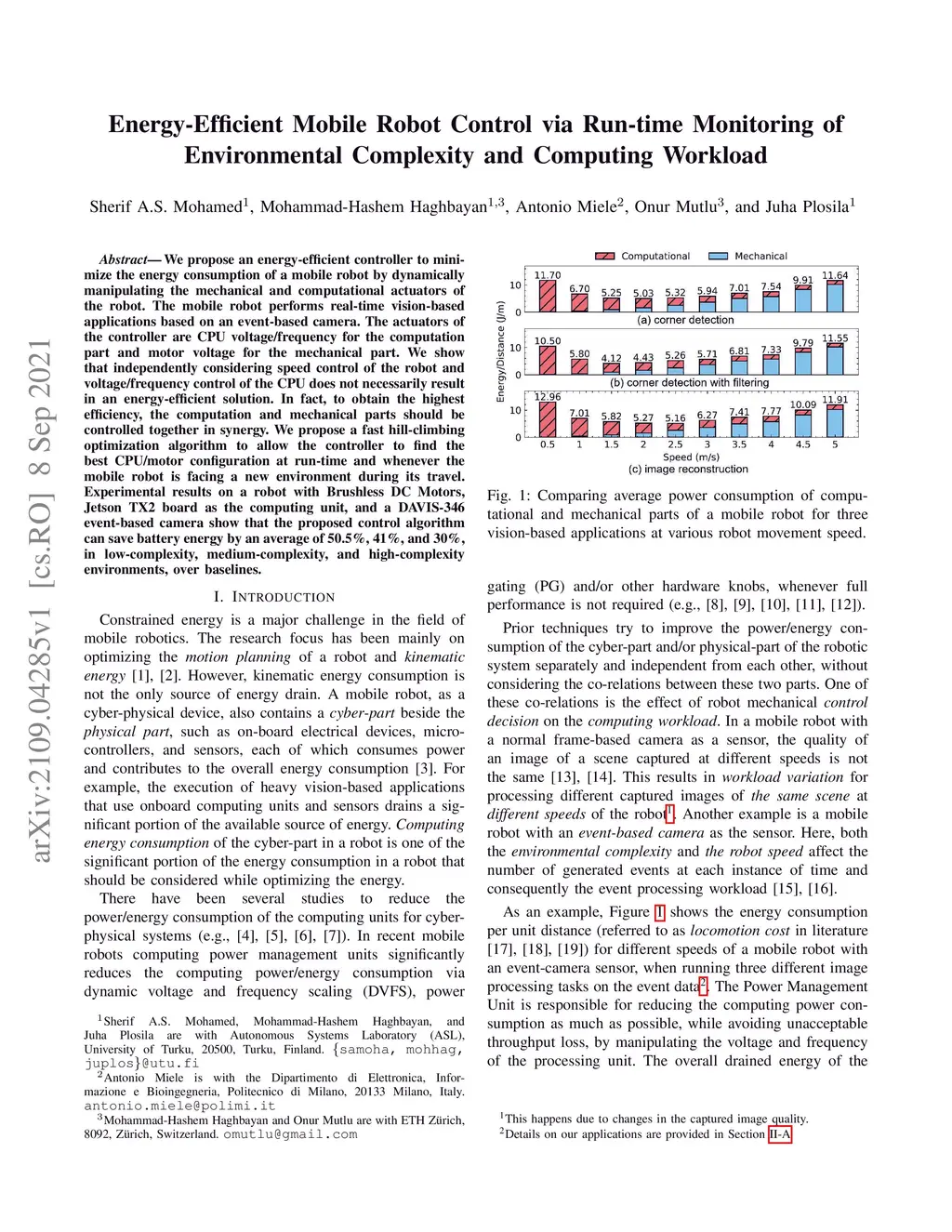 We propose an energy-efficient controller to minimize the energy consumption of a mobile robot by dynamically manipulating the mechanical and computational actuators of the robot. The mobile robot performs real-time vision-based applications based on an event-based camera. The actuators of the controller are CPU voltage/frequency for the computation part and motor voltage for the mechanical part. We show that independently considering speed control of the robot and voltage/frequency control of the CPU does not necessarily result in an energy-efficient solution. In fact, to obtain the highest efficiency, the computation and mechanical parts should be controlled together in synergy. We propose a fast hill-climbing optimization algorithm to allow the controller to find the best CPU/motor configuration at run-time and whenever the mobile robot is facing a new environment during its travel. Experimental results on a robot with Brushless DC Motors, Jetson TX2 board as the computing unit, and a DAVIS-346 event-based camera show that the proposed control algorithm can save battery energy by an average of 50.5%, 41%, and 30%, in low-complexity, medium-complexity, and high-complexity environments, over baselines.