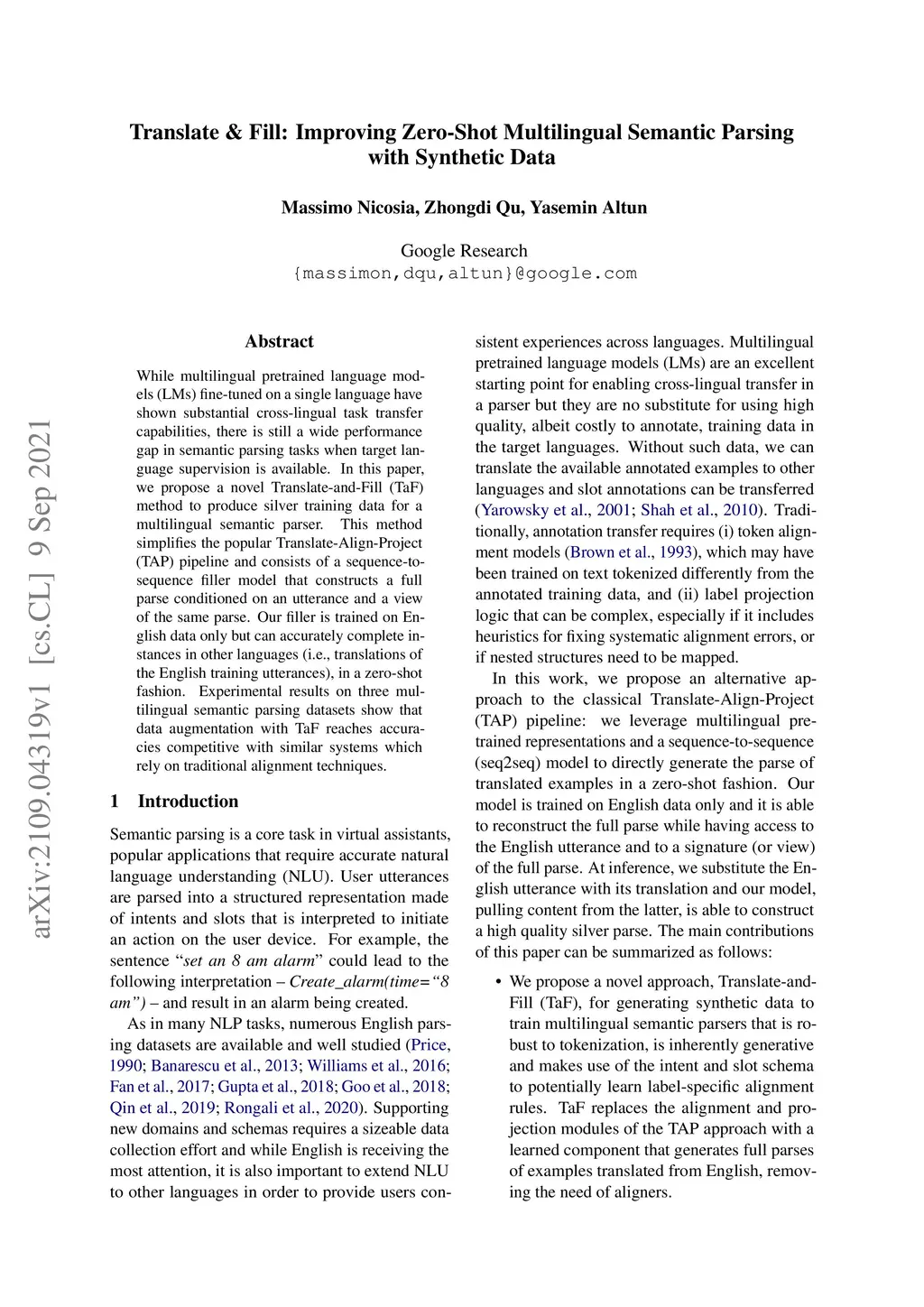 While multilingual pretrained language models (LMs) fine-tuned on a single language have shown substantial cross-lingual task transfer capabilities, there is still a wide performance gap in semantic parsing tasks when target language supervision is available. In this paper, we propose a novel Translate-and-Fill (TaF) method to produce silver training data for a multilingual semantic parser. This method simplifies the popular Translate-Align-Project (TAP) pipeline and consists of a sequence-to-sequence filler model that constructs a full parse conditioned on an utterance and a view of the same parse. Our filler is trained on English data only but can accurately complete instances in other languages (i.e., translations of the English training utterances), in a zero-shot fashion. Experimental results on three multilingual semantic parsing datasets show that data augmentation with TaF reaches accuracies competitive with similar systems which rely on traditional alignment techniques.