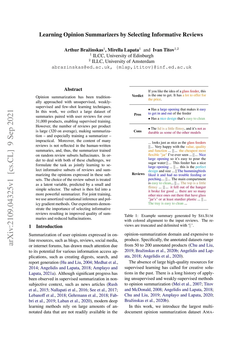 Opinion summarization has been traditionally approached with unsupervised, weakly-supervised and few-shot learning techniques. In this work, we collect a large dataset of summaries paired with user reviews for over 31,000 products, enabling supervised training. However, the number of reviews per product is large (320 on average), making summarization - and especially training a summarizer - impractical. Moreover, the content of many reviews is not reflected in the human-written summaries, and, thus, the summarizer trained on random review subsets hallucinates. In order to deal with both of these challenges, we formulate the task as jointly learning to select informative subsets of reviews and summarizing the opinions expressed in these subsets. The choice of the review subset is treated as a latent variable, predicted by a small and simple selector. The subset is then fed into a more powerful summarizer. For joint training, we use amortized variational inference and policy gradient methods. Our experiments demonstrate the importance of selecting informative reviews resulting in improved quality of summaries and reduced hallucinations.