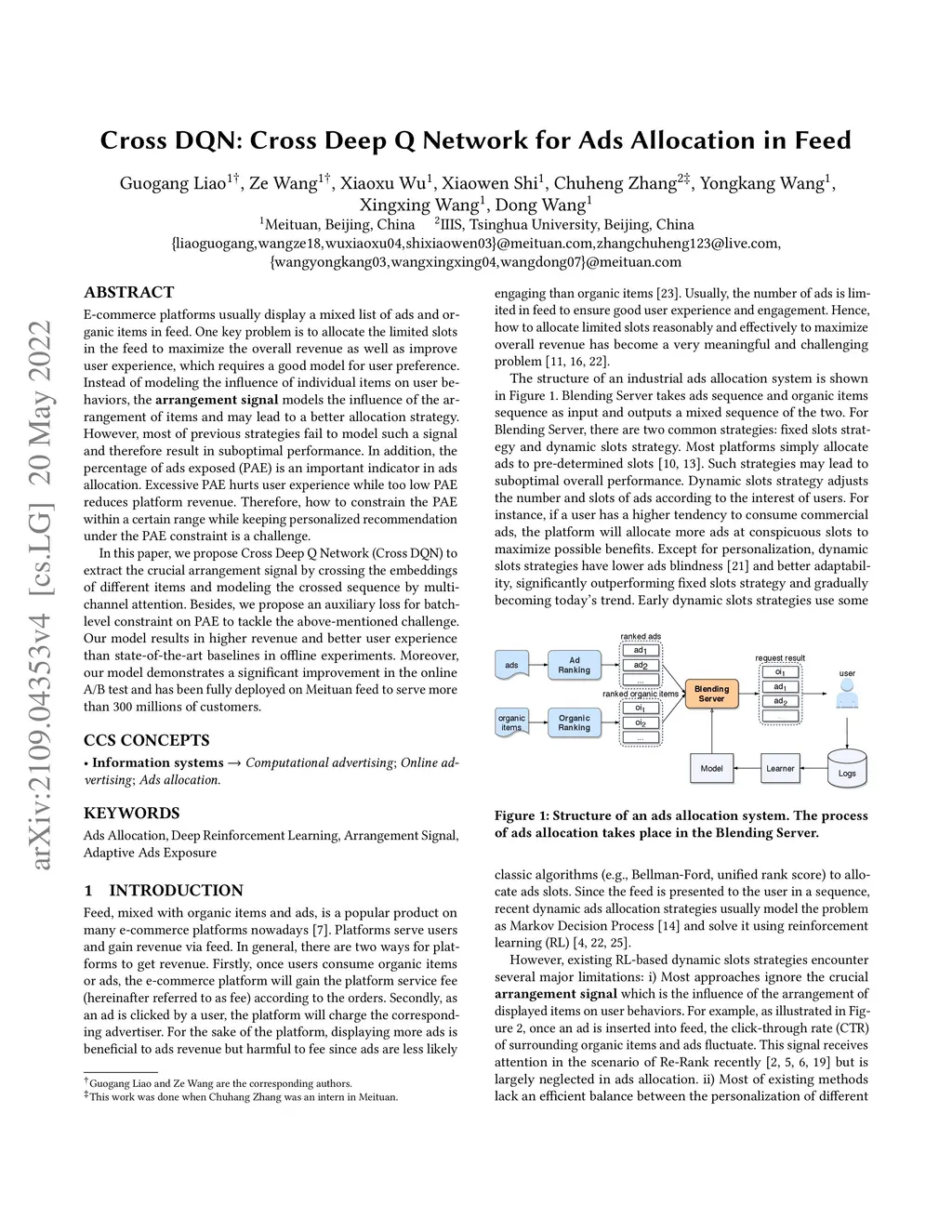 Cross DQN: Cross Deep Q Network for Ads Allocation in Feed