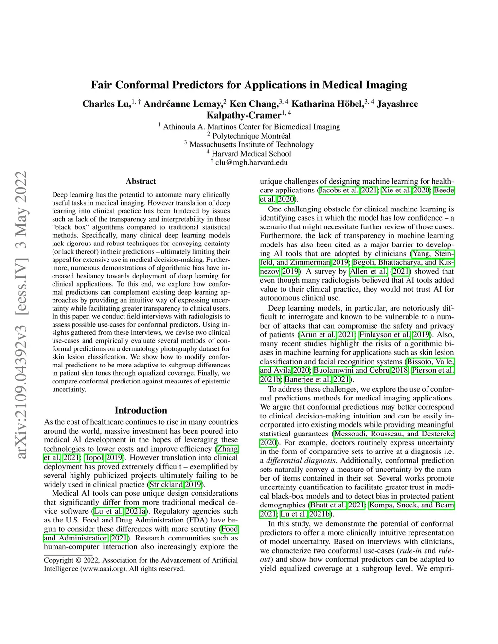 Deep learning has the potential to automate many clinically useful tasks in medical imaging. However translation of deep learning into clinical practice has been hindered by issues such as lack of the transparency and interpretability in these "black box" algorithms compared to traditional statistical methods. Specifically, many clinical deep learning models lack rigorous and robust techniques for conveying certainty (or lack thereof) in their predictions -- ultimately limiting their appeal for extensive use in medical decision-making. Furthermore, numerous demonstrations of algorithmic bias have increased hesitancy towards deployment of deep learning for clinical applications. To this end, we explore how conformal predictions can complement existing deep learning approaches by providing an intuitive way of expressing uncertainty while facilitating greater transparency to clinical users. In this paper, we conduct field interviews with radiologists to assess possible use-cases for conformal predictors. Using insights gathered from these interviews, we devise two clinical use-cases and empirically evaluate several methods of conformal predictions on a dermatology photography dataset for skin lesion classification. We show how to modify conformal predictions to be more adaptive to subgroup differences in patient skin tones through equalized coverage. Finally, we compare conformal prediction against measures of epistemic uncertainty.