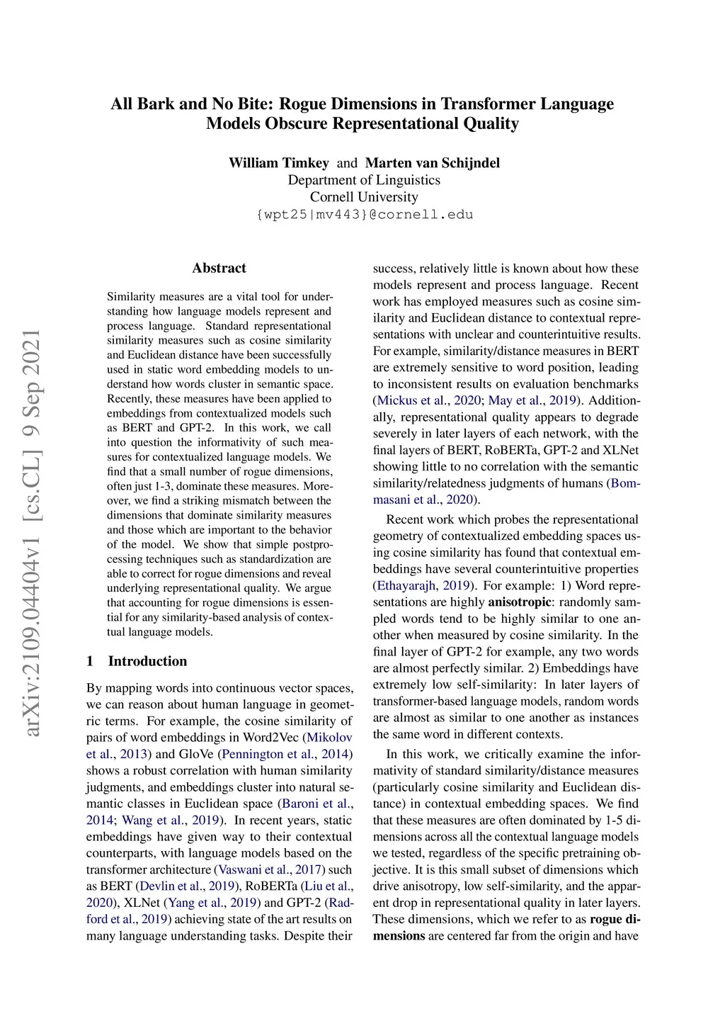 Similarity measures are a vital tool for understanding how language models represent and process language. Standard representational similarity measures such as cosine similarity and Euclidean distance have been successfully used in static word embedding models to understand how words cluster in semantic space. Recently, these measures have been applied to embeddings from contextualized models such as BERT and GPT-2. In this work, we call into question the informativity of such measures for contextualized language models. We find that a small number of rogue dimensions, often just 1-3, dominate these measures. Moreover, we find a striking mismatch between the dimensions that dominate similarity measures and those which are important to the behavior of the model. We show that simple postprocessing techniques such as standardization are able to correct for rogue dimensions and reveal underlying representational quality. We argue that accounting for rogue dimensions is essential for any similarity-based analysis of contextual language models.