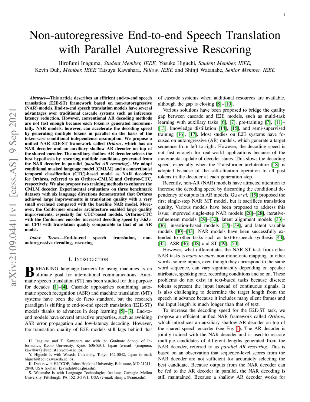 This article describes an efficient end-to-end speech translation (E2E-ST) framework based on non-autoregressive (NAR) models. End-to-end speech translation models have several advantages over traditional cascade systems such as inference latency reduction. However, conventional AR decoding methods are not fast enough because each token is generated incrementally. NAR models, however, can accelerate the decoding speed by generating multiple tokens in parallel on the basis of the token-wise conditional independence assumption. We propose a unified NAR E2E-ST framework called Orthros, which has an NAR decoder and an auxiliary shallow AR decoder on top of the shared encoder. The auxiliary shallow AR decoder selects the best hypothesis by rescoring multiple candidates generated from the NAR decoder in parallel (parallel AR rescoring). We adopt conditional masked language model (CMLM) and a connectionist temporal classification (CTC)-based model as NAR decoders for Orthros, referred to as Orthros-CMLM and Orthros-CTC, respectively. We also propose two training methods to enhance the CMLM decoder. Experimental evaluations on three benchmark datasets with six language directions demonstrated that Orthros achieved large improvements in translation quality with a very small overhead compared with the baseline NAR model. Moreover, the Conformer encoder architecture enabled large quality improvements, especially for CTC-based models. Orthros-CTC with the Conformer encoder increased decoding speed by 3.63x on CPU with translation quality comparable to that of an AR model.