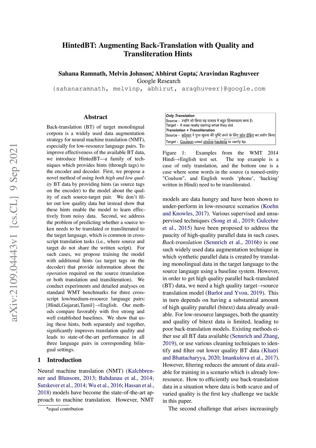 HintedBT: Augmenting Back-Translation with Quality and Transliteration