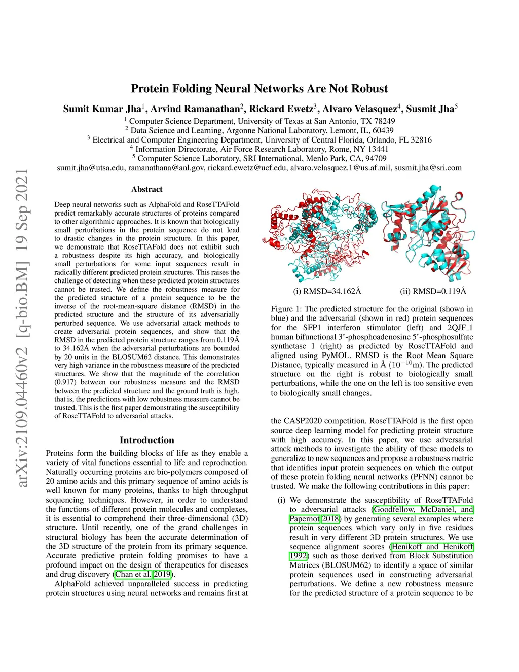 Deep neural networks such as AlphaFold and RoseTTAFold predict remarkably accurate structures of proteins compared to other algorithmic approaches. It is known that biologically small perturbations in the protein sequence do not lead to drastic changes in the protein structure. In this paper, we demonstrate that RoseTTAFold does not exhibit such a robustness despite its high accuracy, and biologically small perturbations for some input sequences result in radically different predicted protein structures. This raises the challenge of detecting when these predicted protein structures cannot be trusted. We define the robustness measure for the predicted structure of a protein sequence to be the inverse of the root-mean-square distance (RMSD) in the predicted structure and the structure of its adversarially perturbed sequence. We use adversarial attack methods to create adversarial protein sequences, and show that the RMSD in the predicted protein structure ranges from 0.119\r{A} to 34.162\r{A} when the adversarial perturbations are bounded by 20 units in the BLOSUM62 distance. This demonstrates very high variance in the robustness measure of the predicted structures. We show that the magnitude of the correlation (0.917) between our robustness measure and the RMSD between the predicted structure and the ground truth is high, that is, the predictions with low robustness measure cannot be trusted. This is the first paper demonstrating the susceptibility of RoseTTAFold to adversarial attacks.