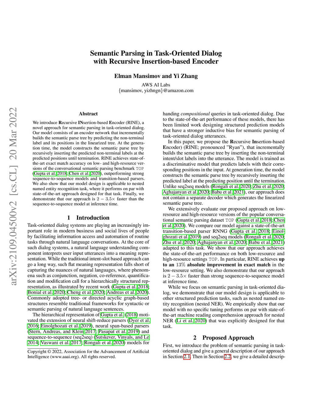 We introduce a Recursive INsertion-based Encoder (RINE), a novel approach for semantic parsing in task-oriented dialog. Our model consists of an encoder network that incrementally builds the semantic parse tree by predicting the non-terminal label and its positions in the linearized tree. At the generation time, the model constructs the semantic parse tree by recursively inserting the predicted non-terminal labels at the predicted positions until termination. RINE achieves state-of-the-art exact match accuracy on low- and high-resource versions of the conversational semantic parsing benchmark TOP (Gupta et al., 2018; Chen et al., 2020), outperforming strong sequence-to-sequence models and transition-based parsers. We also show that our model design is applicable to nested named entity recognition task, where it performs on par with state-of-the-art approach designed for that task. Finally, we demonstrate that our approach is 2-3.5 times faster than the sequence-to-sequence model at inference time.