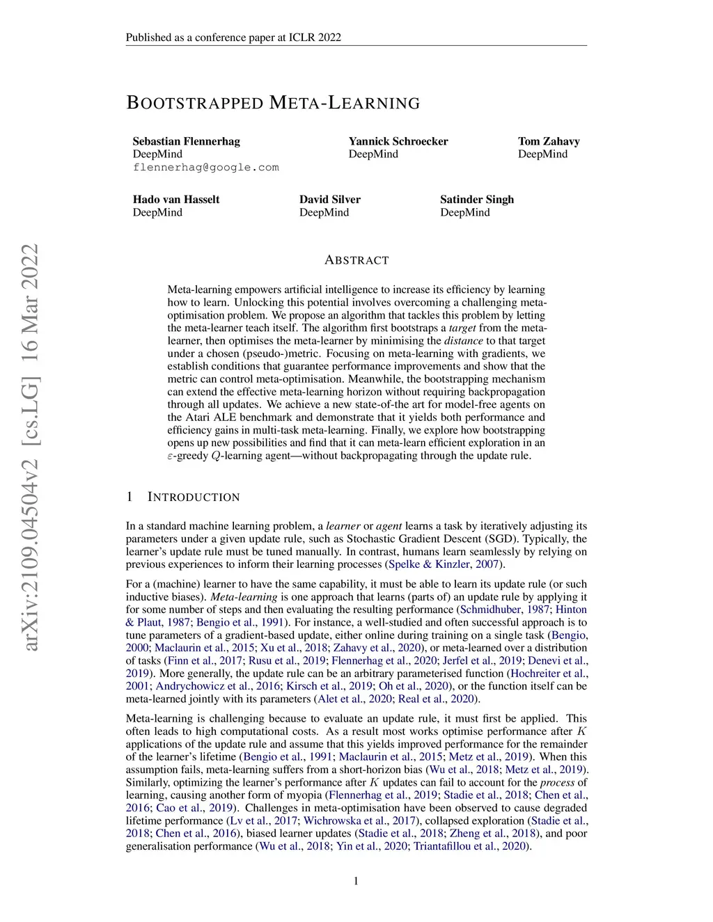 Meta-learning empowers artificial intelligence to increase its efficiency by learning how to learn. Unlocking this potential involves overcoming a challenging meta-optimisation problem. We propose an algorithm that tackles this problem by letting the meta-learner teach itself. The algorithm first bootstraps a target from the meta-learner, then optimises the meta-learner by minimising the distance to that target under a chosen (pseudo-)metric. Focusing on meta-learning with gradients, we establish conditions that guarantee performance improvements and show that the metric can control meta-optimisation. Meanwhile, the bootstrapping mechanism can extend the effective meta-learning horizon without requiring backpropagation through all updates. We achieve a new state-of-the art for model-free agents on the Atari ALE benchmark and demonstrate that it yields both performance and efficiency gains in multi-task meta-learning. Finally, we explore how bootstrapping opens up new possibilities and find that it can meta-learn efficient exploration in an epsilon-greedy Q-learning agent, without backpropagating through the update rule.