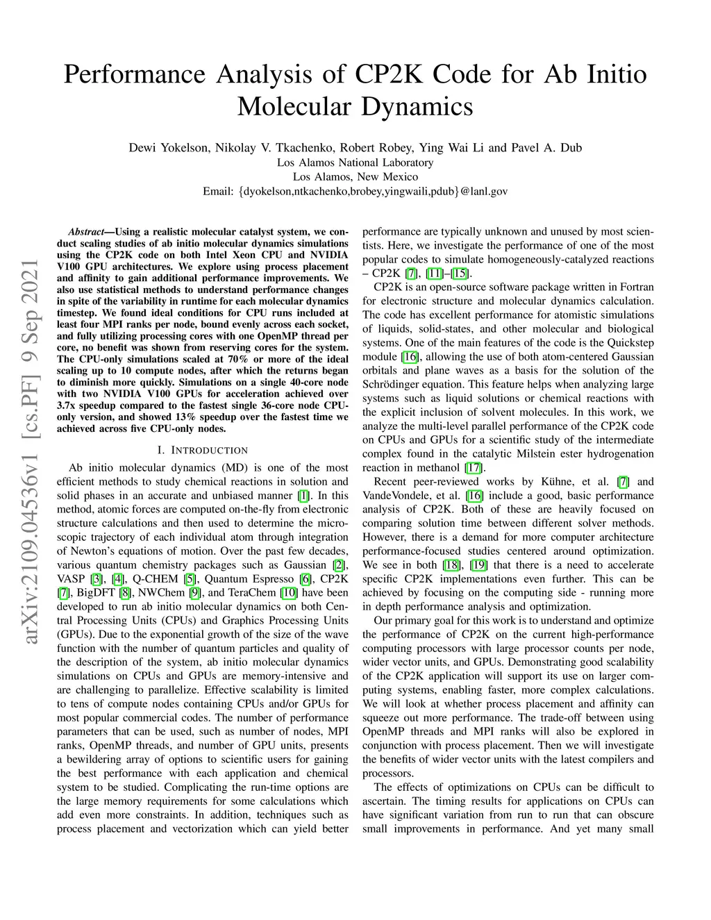 Using a realistic molecular catalyst system, we conduct scaling studies of ab initio molecular dynamics simulations using the CP2K code on both Intel Xeon CPU and NVIDIA V100 GPU architectures. We explore using process placement and affinity to gain additional performance improvements. We also use statistical methods to understand performance changes in spite of the variability in runtime for each molecular dynamics timestep. We found ideal conditions for CPU runs included at least four MPI ranks per node, bound evenly across each socket, and fully utilizing processing cores with one OpenMP thread per core, no benefit was shown from reserving cores for the system. The CPU-only simulations scaled at 70% or more of the ideal scaling up to 10 compute nodes, after which the returns began to diminish more quickly. Simulations on a single 40-core node with two NVIDIA V100 GPUs for acceleration achieved over 3.7x speedup compared to the fastest single 36-core node CPU-only version, and showed 13% speedup over the fastest time we achieved across five CPU-only nodes.