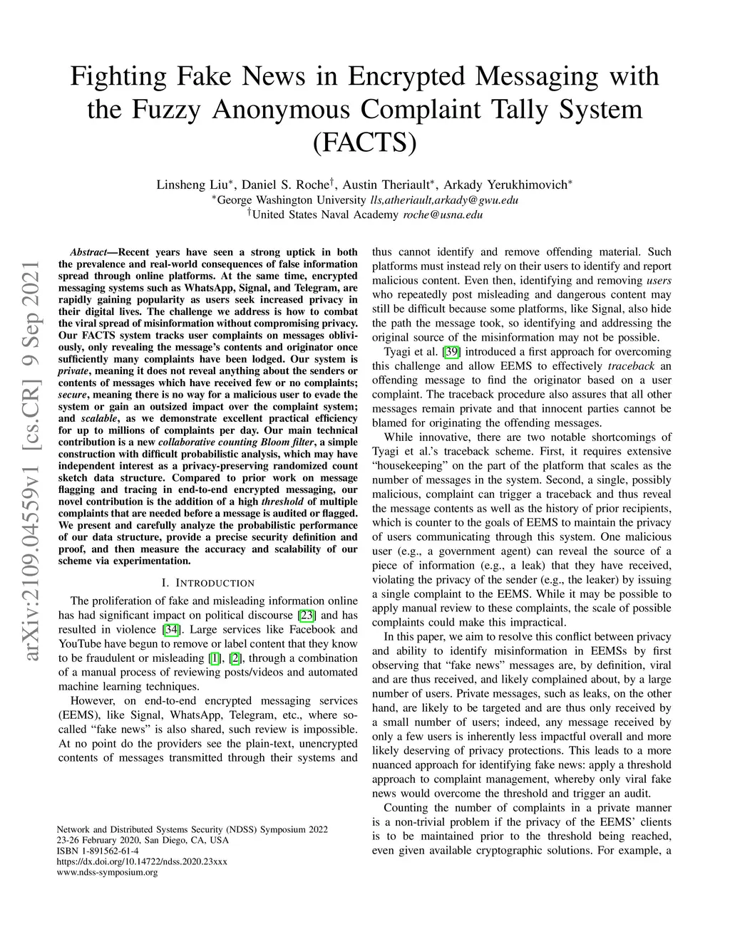 Recent years have seen a strong uptick in both the prevalence and real-world consequences of false information spread through online platforms. At the same time, encrypted messaging systems such as WhatsApp, Signal, and Telegram, are rapidly gaining popularity as users seek increased privacy in their digital lives. The challenge we address is how to combat the viral spread of misinformation without compromising privacy. Our FACTS system tracks user complaints on messages obliviously, only revealing the message's contents and originator once sufficiently many complaints have been lodged. Our system is private, meaning it does not reveal anything about the senders or contents of messages which have received few or no complaints; secure, meaning there is no way for a malicious user to evade the system or gain an outsized impact over the complaint system; and scalable, as we demonstrate excellent practical efficiency for up to millions of complaints per day. Our main technical contribution is a new collaborative counting Bloom filter, a simple construction with difficult probabilistic analysis, which may have independent interest as a privacy-preserving randomized count sketch data structure. Compared to prior work on message flagging and tracing in end-to-end encrypted messaging, our novel contribution is the addition of a high threshold of multiple complaints that are needed before a message is audited or flagged. We present and carefully analyze the probabilistic performance of our data structure, provide a precise security definition and proof, and then measure the accuracy and scalability of our scheme via experimentation.