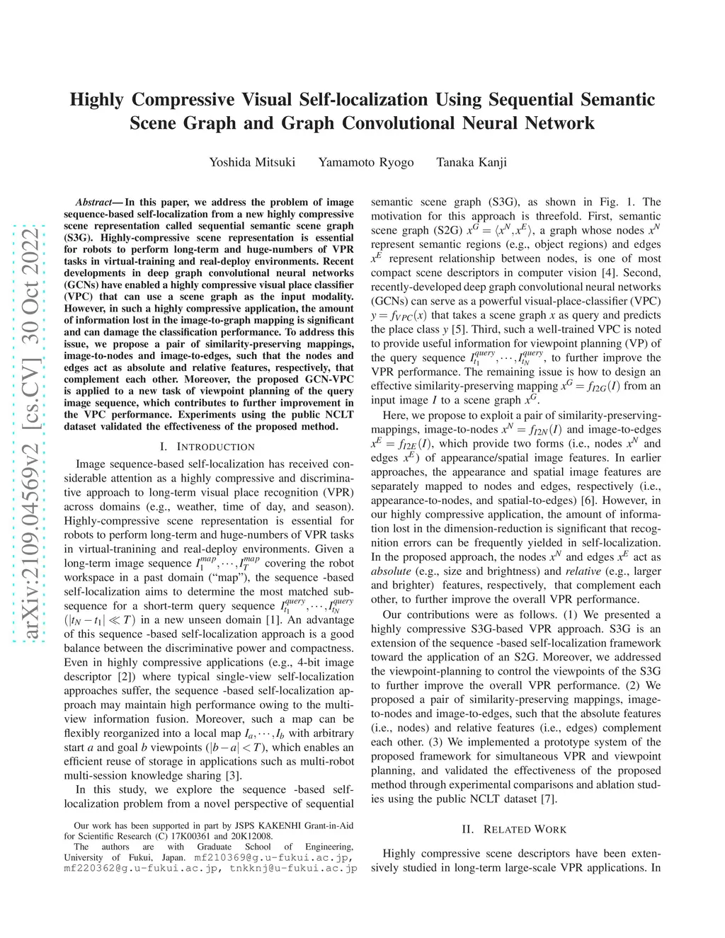 In this paper, we address the problem of image sequence-based self-localization from a new highly compressive scene representation called sequential semantic scene graph (S3G). Highly-compressive scene representation is essential for robots to perform long-term and huge-numbers of VPR tasks in virtual-training and real-deploy environments. Recent developments in deep graph convolutional neural networks (GCNs) have enabled a highly compressive visual place classifier (VPC) that can use a scene graph as the input modality. However, in such a highly compressive application, the amount of information lost in the image-to-graph mapping is significant and can damage the classification performance. To address this issue, we propose a pair of similarity-preserving mappings, image-to-nodes and image-to-edges, such that the nodes and edges act as absolute and relative features, respectively, that complement each other. Moreover, the proposed GCN-VPC is applied to a new task of viewpoint planning of the query image sequence, which contributes to further improvement in the VPC performance. Experiments using the public NCLT dataset validated the effectiveness of the proposed method.