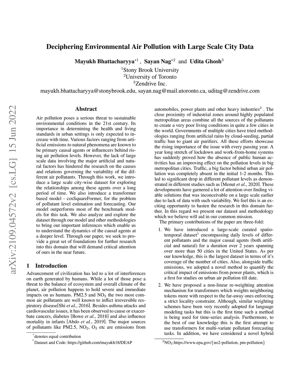 Air pollution poses a serious threat to sustainable environmental conditions in the 21st century. Its importance in determining the health and living standards in urban settings is only expected to increase with time. Various factors ranging from artificial emissions to natural phenomena are known to be primary causal agents or influencers behind rising air pollution levels. However, the lack of large scale data involving the major artificial and natural factors has hindered the research on the causes and relations governing the variability of the different air pollutants. Through this work, we introduce a large scale city-wise dataset for exploring the relationships among these agents over a long period of time. We also introduce a transformer based model - cosSquareFormer, for the problem of pollutant level estimation and forecasting. Our model outperforms most of the benchmark models for this task. We also analyze and explore the dataset through our model and other methodologies to bring out important inferences which enable us to understand the dynamics of the causal agents at a deeper level. Through our paper, we seek to provide a great set of foundations for further research into this domain that will demand critical attention of ours in the near future.