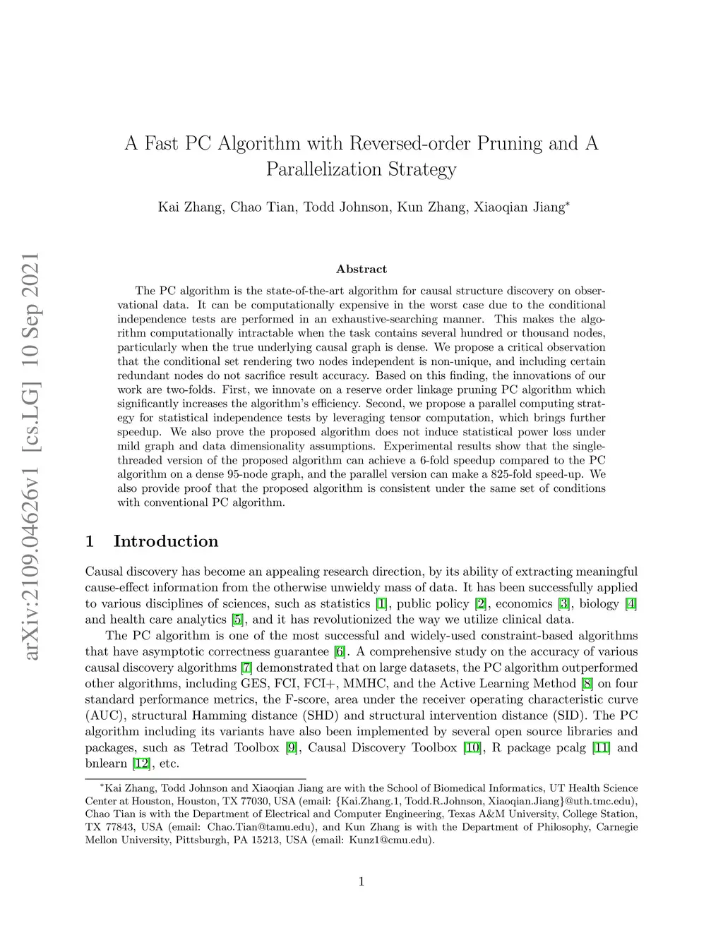 The PC algorithm is the state-of-the-art algorithm for causal structure discovery on observational data. It can be computationally expensive in the worst case due to the conditional independence tests are performed in an exhaustive-searching manner. This makes the algorithm computationally intractable when the task contains several hundred or thousand nodes, particularly when the true underlying causal graph is dense. We propose a critical observation that the conditional set rendering two nodes independent is non-unique, and including certain redundant nodes do not sacrifice result accuracy. Based on this finding, the innovations of our work are two-folds. First, we innovate on a reserve order linkage pruning PC algorithm which significantly increases the algorithm's efficiency. Second, we propose a parallel computing strategy for statistical independence tests by leveraging tensor computation, which brings further speedup. We also prove the proposed algorithm does not induce statistical power loss under mild graph and data dimensionality assumptions. Experimental results show that the single-threaded version of the proposed algorithm can achieve a 6-fold speedup compared to the PC algorithm on a dense 95-node graph, and the parallel version can make a 825-fold speed-up. We also provide proof that the proposed algorithm is consistent under the same set of conditions with conventional PC algorithm.