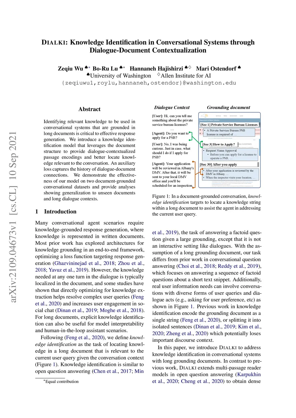 Identifying relevant knowledge to be used in conversational systems that are grounded in long documents is critical to effective response generation. We introduce a knowledge identification model that leverages the document structure to provide dialogue-contextualized passage encodings and better locate knowledge relevant to the conversation. An auxiliary loss captures the history of dialogue-document connections. We demonstrate the effectiveness of our model on two document-grounded conversational datasets and provide analyses showing generalization to unseen documents and long dialogue contexts.