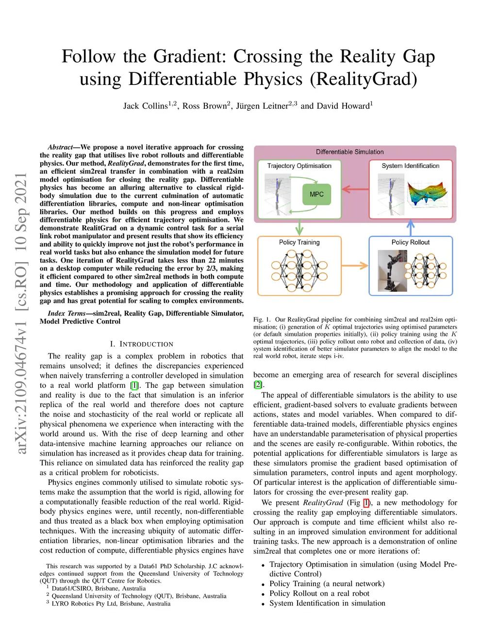 We propose a novel iterative approach for crossing the reality gap that utilises live robot rollouts and differentiable physics. Our method, RealityGrad, demonstrates for the first time, an efficient sim2real transfer in combination with a real2sim model optimisation for closing the reality gap. Differentiable physics has become an alluring alternative to classical rigid-body simulation due to the current culmination of automatic differentiation libraries, compute and non-linear optimisation libraries. Our method builds on this progress and employs differentiable physics for efficient trajectory optimisation. We demonstrate RealitGrad on a dynamic control task for a serial link robot manipulator and present results that show its efficiency and ability to quickly improve not just the robot's performance in real world tasks but also enhance the simulation model for future tasks. One iteration of RealityGrad takes less than 22 minutes on a desktop computer while reducing the error by 2/3, making it efficient compared to other sim2real methods in both compute and time. Our methodology and application of differentiable physics establishes a promising approach for crossing the reality gap and has great potential for scaling to complex environments.