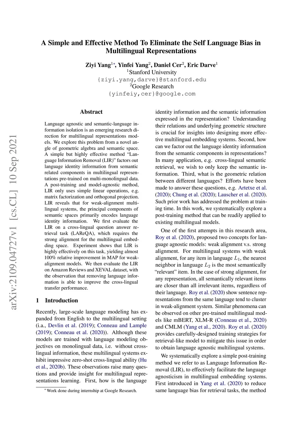 Language agnostic and semantic-language information isolation is an emerging research direction for multilingual representations models. We explore this problem from a novel angle of geometric algebra and semantic space. A simple but highly effective method "Language Information Removal (LIR)" factors out language identity information from semantic related components in multilingual representations pre-trained on multi-monolingual data. A post-training and model-agnostic method, LIR only uses simple linear operations, e.g. matrix factorization and orthogonal projection. LIR reveals that for weak-alignment multilingual systems, the principal components of semantic spaces primarily encodes language identity information. We first evaluate the LIR on a cross-lingual question answer retrieval task (LAReQA), which requires the strong alignment for the multilingual embedding space. Experiment shows that LIR is highly effectively on this task, yielding almost 100% relative improvement in MAP for weak-alignment models. We then evaluate the LIR on Amazon Reviews and XEVAL dataset, with the observation that removing language information is able to improve the cross-lingual transfer performance.