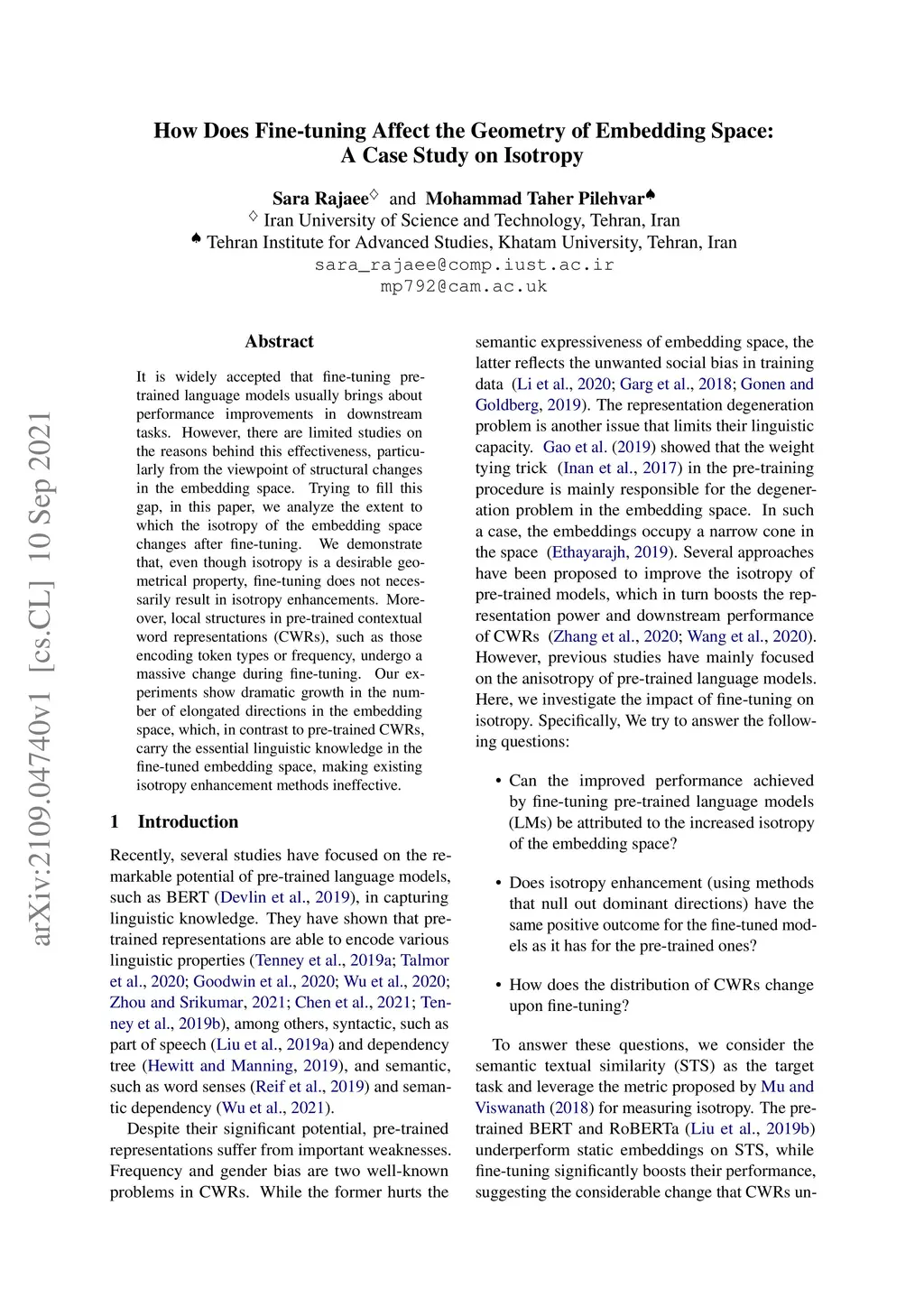 How Does Fine-tuning Affect the Geometry of Embedding Space: A Case