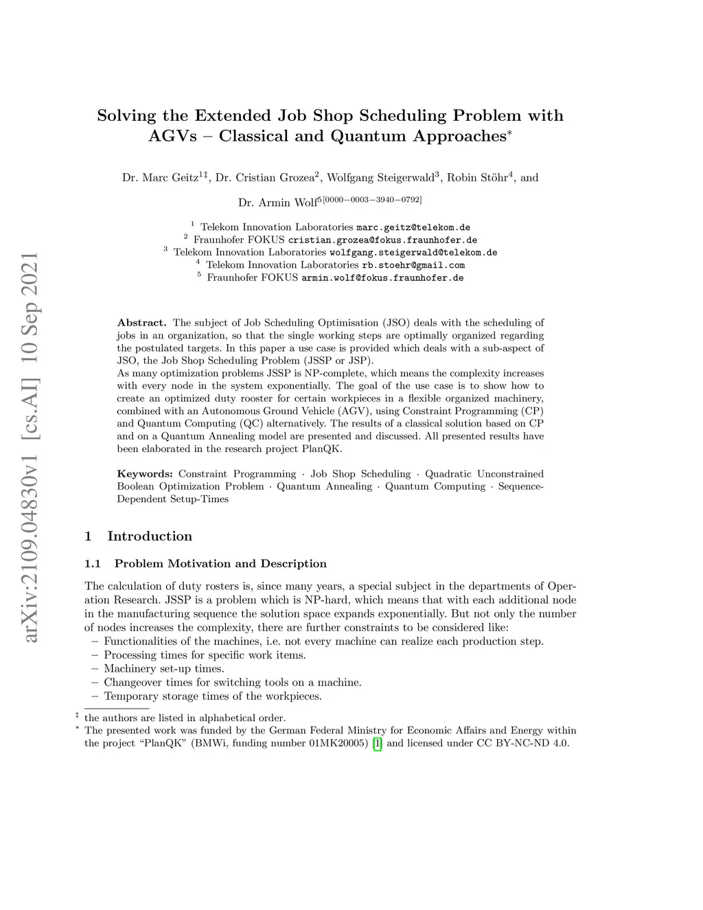 The subject of Job Scheduling Optimisation (JSO) deals with the scheduling of jobs in an organization, so that the single working steps are optimally organized regarding the postulated targets. In this paper a use case is provided which deals with a sub-aspect of JSO, the Job Shop Scheduling Problem (JSSP or JSP). As many optimization problems JSSP is NP-complete, which means the complexity increases with every node in the system exponentially. The goal of the use case is to show how to create an optimized duty rooster for certain workpieces in a flexible organized machinery, combined with an Autonomous Ground Vehicle (AGV), using Constraint Programming (CP) and Quantum Computing (QC) alternatively. The results of a classical solution based on CP and on a Quantum Annealing model are presented and discussed. All presented results have been elaborated in the research project PlanQK.