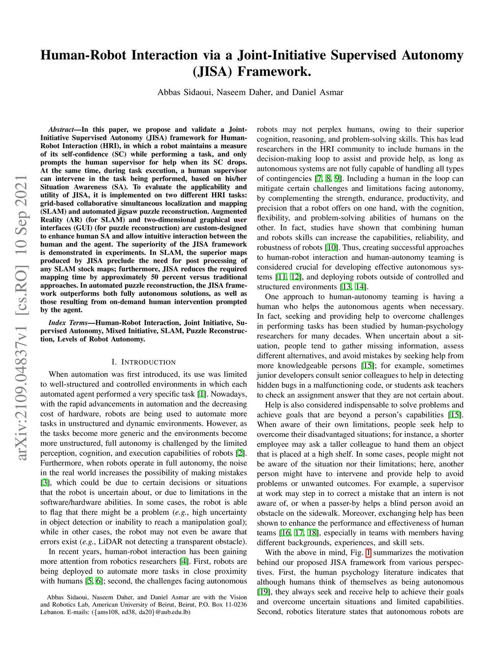 In this paper, we propose and validate a Joint-Initiative Supervised Autonomy (JISA) framework for Human-Robot Interaction (HRI), in which a robot maintains a measure of its self-confidence (SC) while performing a task, and only prompts the human supervisor for help when its SC drops. At the same time, during task execution, a human supervisor can intervene in the task being performed, based on his/her Situation Awareness (SA). To evaluate the applicability and utility of JISA, it is implemented on two different HRI tasks: grid-based collaborative simultaneous localization and mapping (SLAM) and automated jigsaw puzzle reconstruction. Augmented Reality (AR) (for SLAM) and two-dimensional graphical user interfaces (GUI) (for puzzle reconstruction) are custom-designed to enhance human SA and allow intuitive interaction between the human and the agent. The superiority of the JISA framework is demonstrated in experiments. In SLAM, the superior maps produced by JISA preclude the need for post processing of any SLAM stock maps; furthermore, JISA reduces the required mapping time by approximately 50 percent versus traditional approaches. In automated puzzle reconstruction, the JISA framework outperforms both fully autonomous solutions, as well as those resulting from on-demand human intervention prompted by the agent.