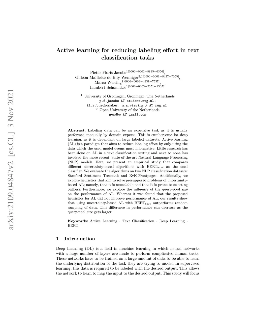 Labeling data can be an expensive task as it is usually performed manually by domain experts. This is cumbersome for deep learning, as it is dependent on large labeled datasets. Active learning (AL) is a paradigm that aims to reduce labeling effort by only using the data which the used model deems most informative. Little research has been done on AL in a text classification setting and next to none has involved the more recent, state-of-the-art Natural Language Processing (NLP) models. Here, we present an empirical study that compares different uncertainty-based algorithms with BERT as the used classifier. We evaluate the algorithms on two NLP classification datasets: Stanford Sentiment Treebank and KvK-Frontpages. Additionally, we explore heuristics that aim to solve presupposed problems of uncertainty-based AL; namely, that it is unscalable and that it is prone to selecting outliers. Furthermore, we explore the influence of the query-pool size on the performance of AL. Whereas it was found that the proposed heuristics for AL did not improve performance of AL; our results show that using uncertainty-based AL with BERT outperforms random sampling of data. This difference in performance can decrease as the query-pool size gets larger.
