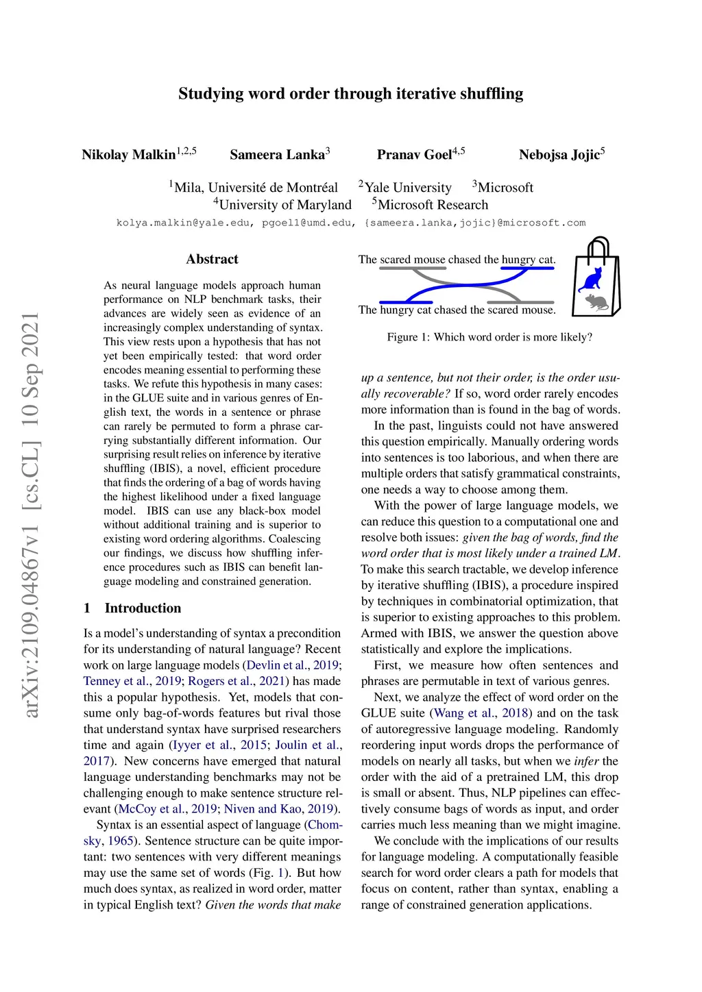 As neural language models approach human performance on NLP benchmark tasks, their advances are widely seen as evidence of an increasingly complex understanding of syntax. This view rests upon a hypothesis that has not yet been empirically tested: that word order encodes meaning essential to performing these tasks. We refute this hypothesis in many cases: in the GLUE suite and in various genres of English text, the words in a sentence or phrase can rarely be permuted to form a phrase carrying substantially different information. Our surprising result relies on inference by iterative shuffling (IBIS), a novel, efficient procedure that finds the ordering of a bag of words having the highest likelihood under a fixed language model. IBIS can use any black-box model without additional training and is superior to existing word ordering algorithms. Coalescing our findings, we discuss how shuffling inference procedures such as IBIS can benefit language modeling and constrained generation.