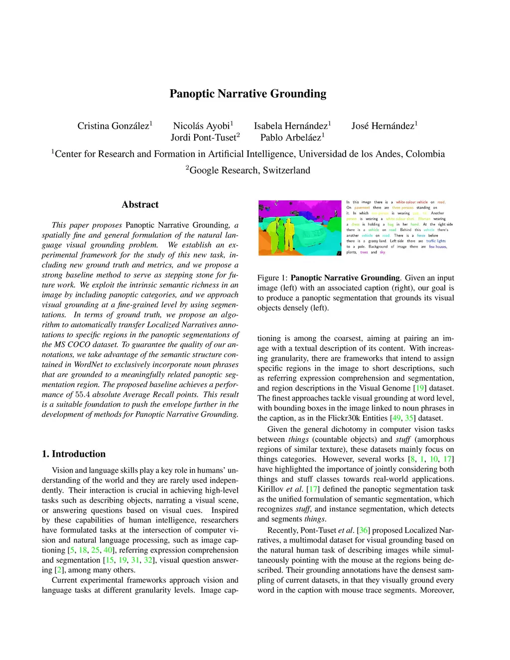 This paper proposes Panoptic Narrative Grounding, a spatially fine and general formulation of the natural language visual grounding problem. We establish an experimental framework for the study of this new task, including new ground truth and metrics, and we propose a strong baseline method to serve as stepping stone for future work. We exploit the intrinsic semantic richness in an image by including panoptic categories, and we approach visual grounding at a fine-grained level by using segmentations. In terms of ground truth, we propose an algorithm to automatically transfer Localized Narratives annotations to specific regions in the panoptic segmentations of the MS COCO dataset. To guarantee the quality of our annotations, we take advantage of the semantic structure contained in WordNet to exclusively incorporate noun phrases that are grounded to a meaningfully related panoptic segmentation region. The proposed baseline achieves a performance of 55.4 absolute Average Recall points. This result is a suitable foundation to push the envelope further in the development of methods for Panoptic Narrative Grounding.