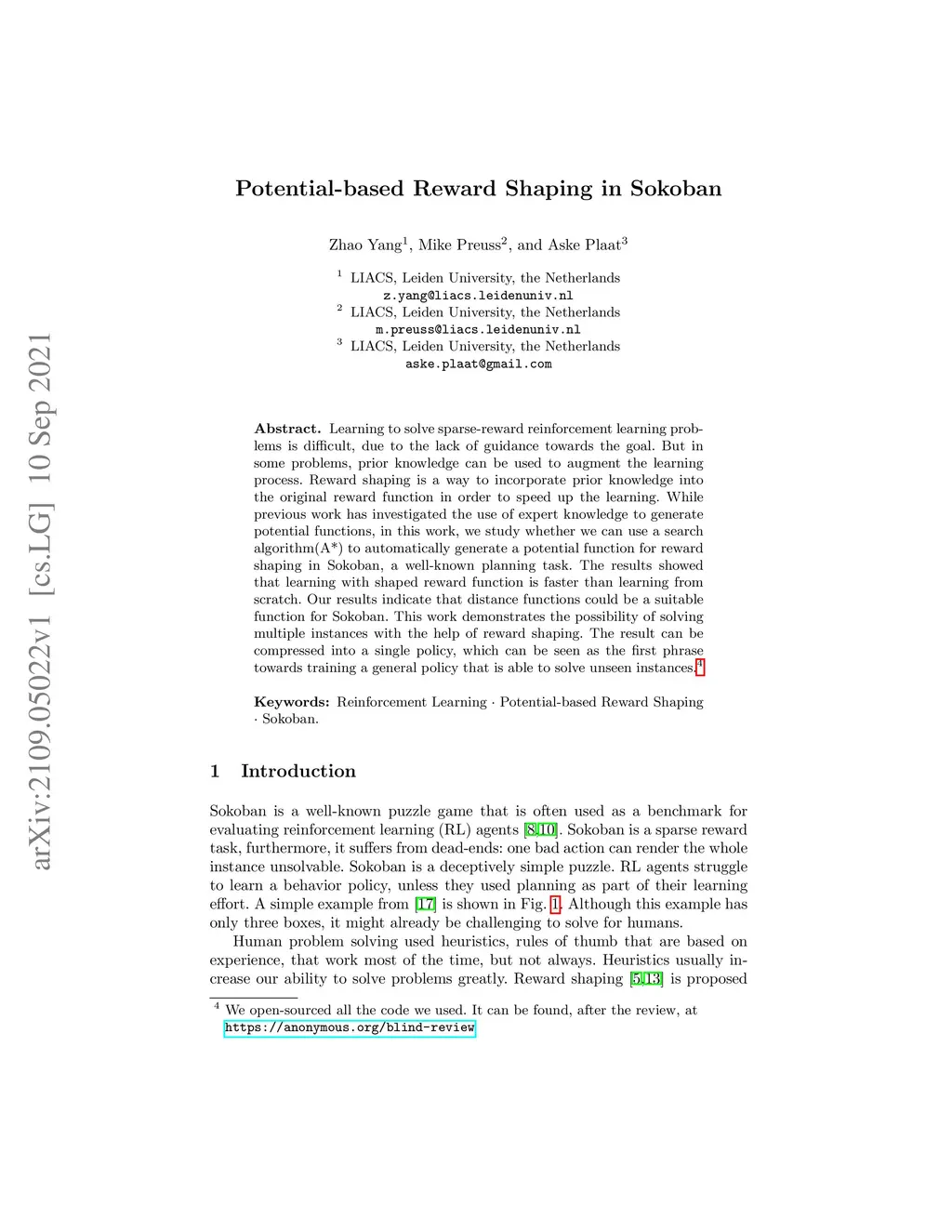 Learning to solve sparse-reward reinforcement learning problems is difficult, due to the lack of guidance towards the goal. But in some problems, prior knowledge can be used to augment the learning process. Reward shaping is a way to incorporate prior knowledge into the original reward function in order to speed up the learning. While previous work has investigated the use of expert knowledge to generate potential functions, in this work, we study whether we can use a search algorithm(A*) to automatically generate a potential function for reward shaping in Sokoban, a well-known planning task. The results showed that learning with shaped reward function is faster than learning from scratch. Our results indicate that distance functions could be a suitable function for Sokoban. This work demonstrates the possibility of solving multiple instances with the help of reward shaping. The result can be compressed into a single policy, which can be seen as the first phrase towards training a general policy that is able to solve unseen instances.