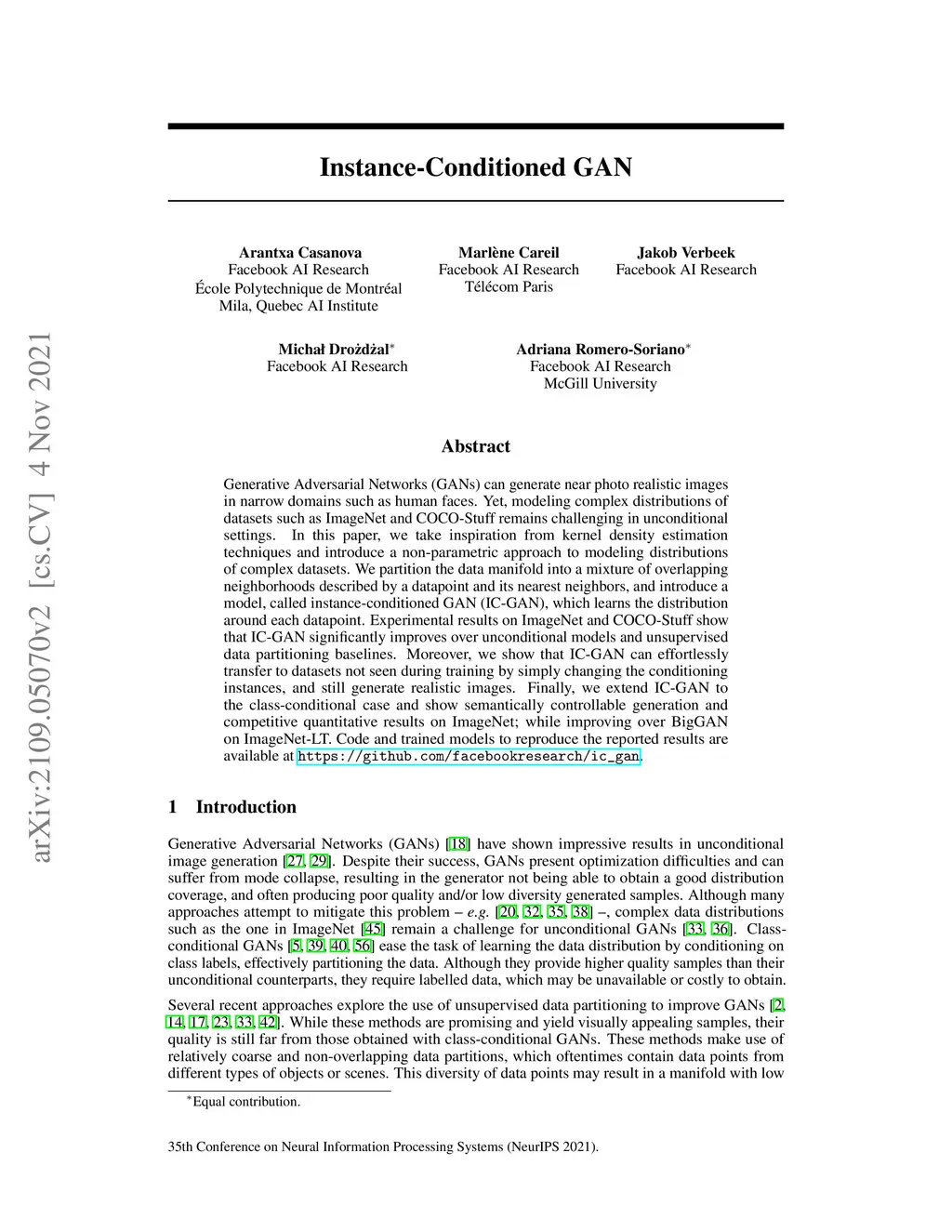 Generative Adversarial Networks (GANs) can generate near photo realistic images in narrow domains such as human faces. Yet, modeling complex distributions of datasets such as ImageNet and COCO-Stuff remains challenging in unconditional settings. In this paper, we take inspiration from kernel density estimation techniques and introduce a non-parametric approach to modeling distributions of complex datasets. We partition the data manifold into a mixture of overlapping neighborhoods described by a datapoint and its nearest neighbors, and introduce a model, called instance-conditioned GAN (IC-GAN), which learns the distribution around each datapoint. Experimental results on ImageNet and COCO-Stuff show that IC-GAN significantly improves over unconditional models and unsupervised data partitioning baselines. Moreover, we show that IC-GAN can effortlessly transfer to datasets not seen during training by simply changing the conditioning instances, and still generate realistic images. Finally, we extend IC-GAN to the class-conditional case and show semantically controllable generation and competitive quantitative results on ImageNet; while improving over BigGAN on ImageNet-LT. Code and trained models to reproduce the reported results are available at https://github.com/facebookresearch/ic_gan.