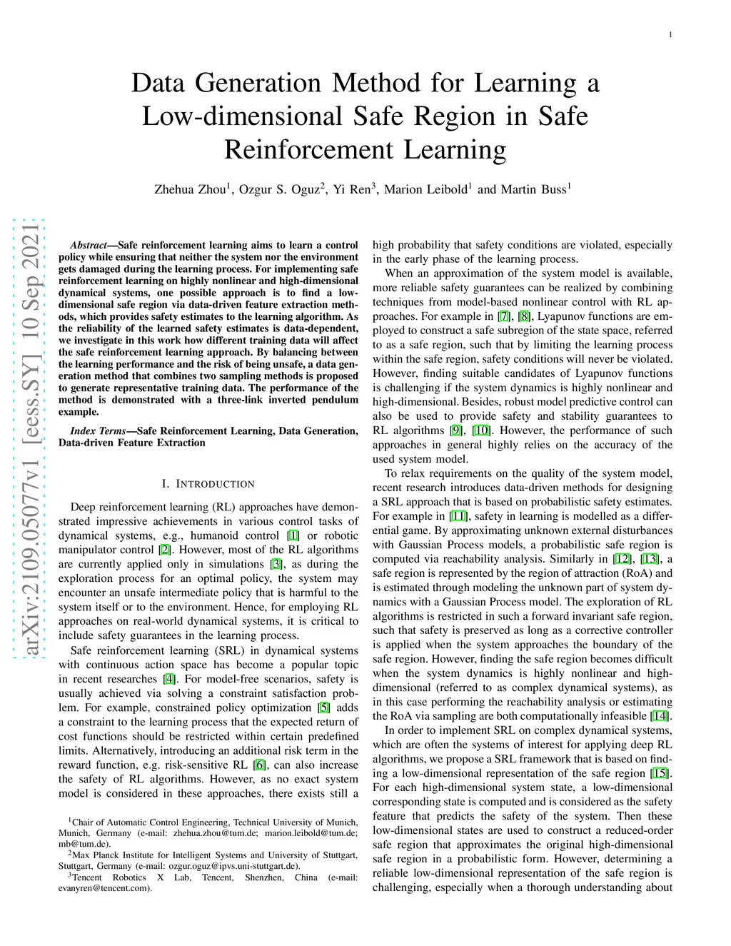 Safe reinforcement learning aims to learn a control policy while ensuring that neither the system nor the environment gets damaged during the learning process. For implementing safe reinforcement learning on highly nonlinear and high-dimensional dynamical systems, one possible approach is to find a low-dimensional safe region via data-driven feature extraction methods, which provides safety estimates to the learning algorithm. As the reliability of the learned safety estimates is data-dependent, we investigate in this work how different training data will affect the safe reinforcement learning approach. By balancing between the learning performance and the risk of being unsafe, a data generation method that combines two sampling methods is proposed to generate representative training data. The performance of the method is demonstrated with a three-link inverted pendulum example.
