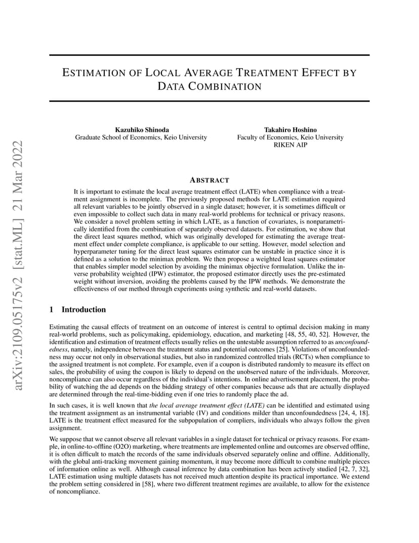 It is important to estimate the local average treatment effect (LATE) when compliance with a treatment assignment is incomplete. The previously proposed methods for LATE estimation required all relevant variables to be jointly observed in a single dataset; however, it is sometimes difficult or even impossible to collect such data in many real-world problems for technical or privacy reasons. We consider a novel problem setting in which LATE, as a function of covariates, is nonparametrically identified from the combination of separately observed datasets. For estimation, we show that the direct least squares method, which was originally developed for estimating the average treatment effect under complete compliance, is applicable to our setting. However, model selection and hyperparameter tuning for the direct least squares estimator can be unstable in practice since it is defined as a solution to the minimax problem. We then propose a weighted least squares estimator that enables simpler model selection by avoiding the minimax objective formulation. Unlike the inverse probability weighted (IPW) estimator, the proposed estimator directly uses the pre-estimated weight without inversion, avoiding the problems caused by the IPW methods. We demonstrate the effectiveness of our method through experiments using synthetic and real-world datasets.