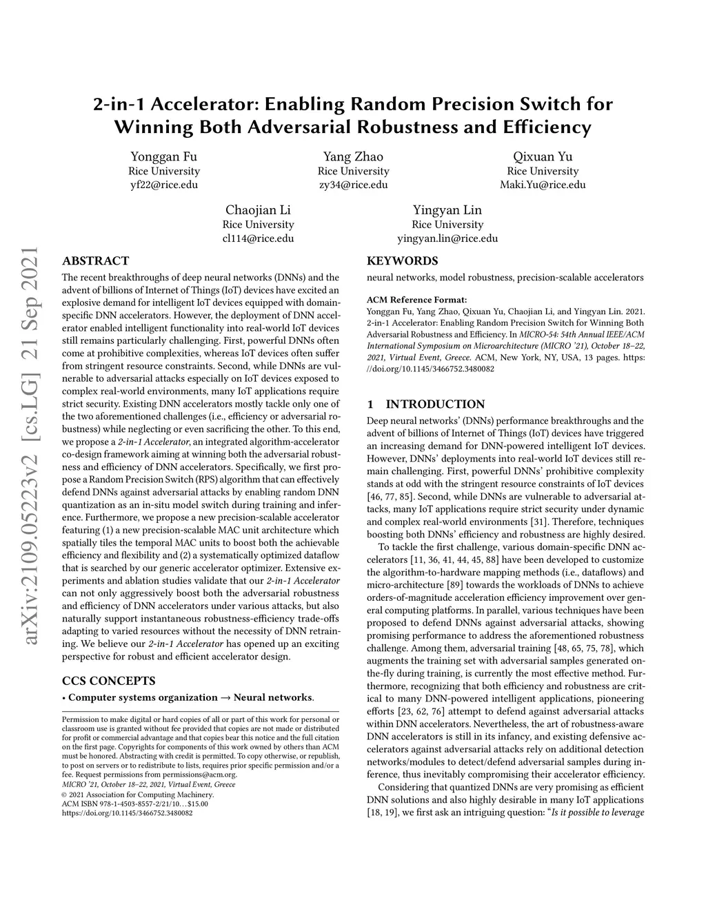 The recent breakthroughs of deep neural networks (DNNs) and the advent of billions of Internet of Things (IoT) devices have excited an explosive demand for intelligent IoT devices equipped with domain-specific DNN accelerators. However, the deployment of DNN accelerator enabled intelligent functionality into real-world IoT devices still remains particularly challenging. First, powerful DNNs often come at prohibitive complexities, whereas IoT devices often suffer from stringent resource constraints. Second, while DNNs are vulnerable to adversarial attacks especially on IoT devices exposed to complex real-world environments, many IoT applications require strict security. Existing DNN accelerators mostly tackle only one of the two aforementioned challenges (i.e., efficiency or adversarial robustness) while neglecting or even sacrificing the other. To this end, we propose a 2-in-1 Accelerator, an integrated algorithm-accelerator co-design framework aiming at winning both the adversarial robustness and efficiency of DNN accelerators. Specifically, we first propose a Random Precision Switch (RPS) algorithm that can effectively defend DNNs against adversarial attacks by enabling random DNN quantization as an in-situ model switch. Furthermore, we propose a new precision-scalable accelerator featuring (1) a new precision-scalable MAC unit architecture which spatially tiles the temporal MAC units to boost both the achievable efficiency and flexibility and (2) a systematically optimized dataflow that is searched by our generic accelerator optimizer. Extensive experiments and ablation studies validate that our 2-in-1 Accelerator can not only aggressively boost both the adversarial robustness and efficiency of DNN accelerators under various attacks, but also naturally support instantaneous robustness-efficiency trade-offs adapting to varied resources without the necessity of DNN retraining.